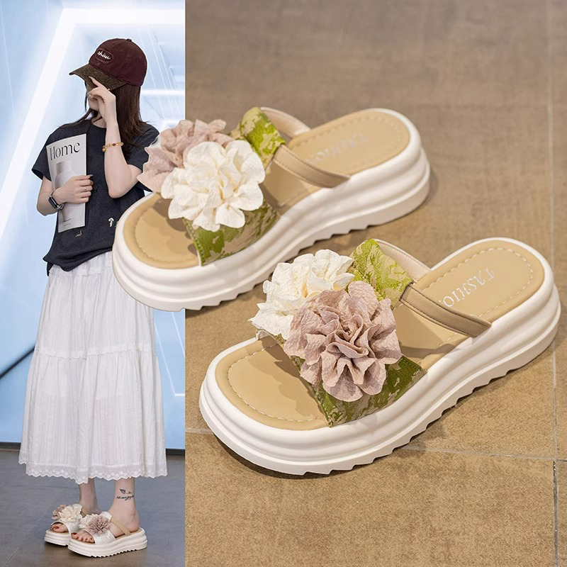 34码 女士海边度假花朵沙滩鞋 小香风夏外穿2025新款 厚底配裙子拖鞋