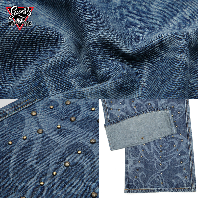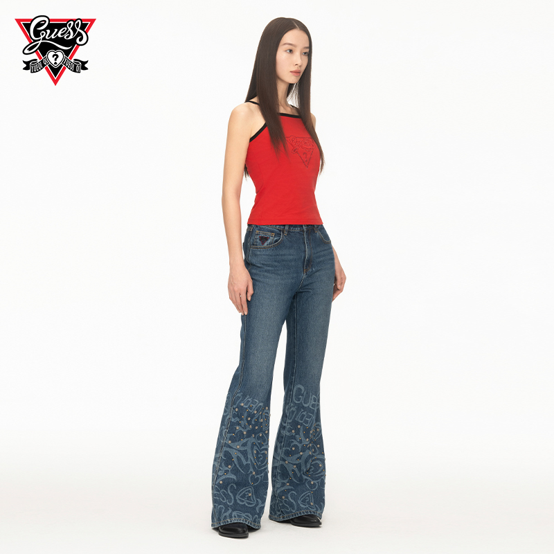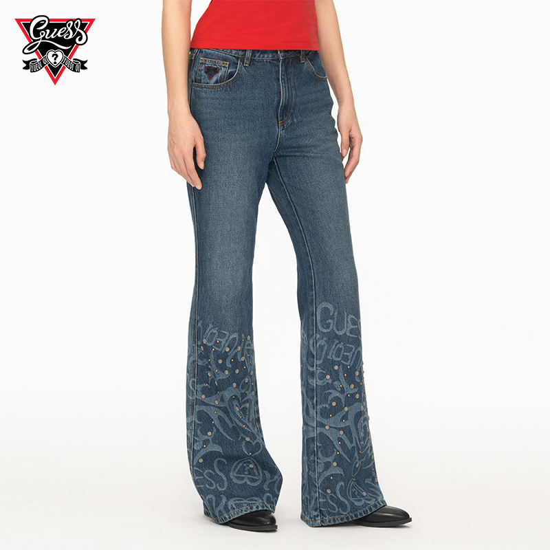 QI联名系列 YUEQI 女士铆钉镭射印花中高腰牛仔喇叭裤 GUESS