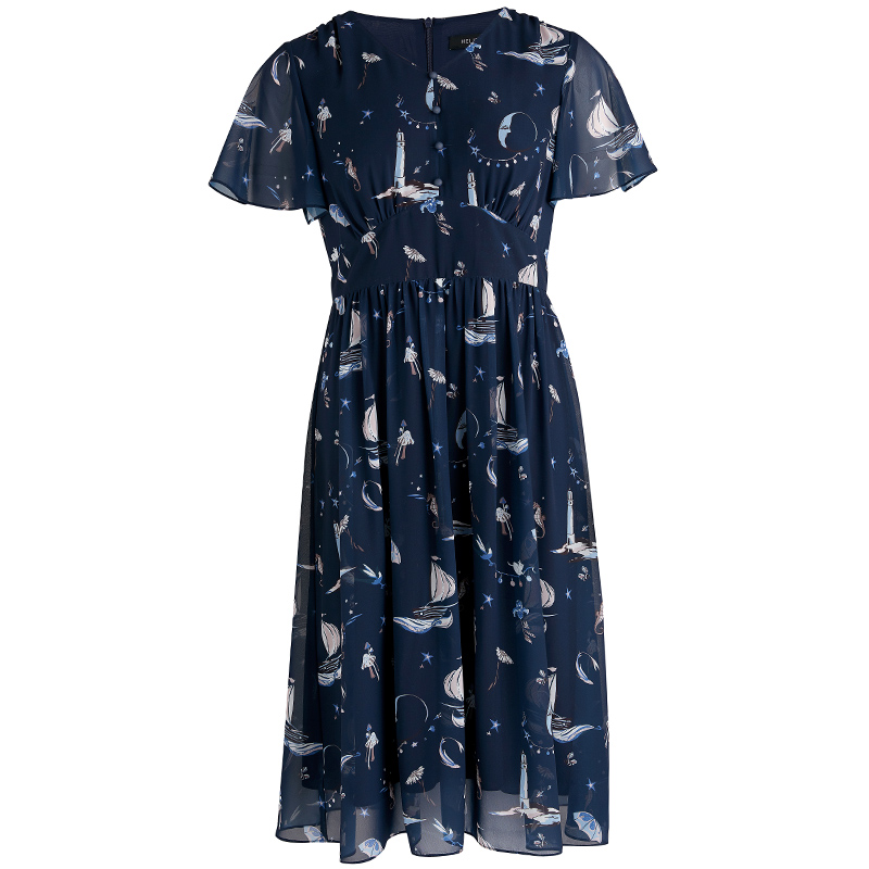 学院风蕾丝一字肩藏蓝色连衣裙女夏季 设计感小众掐腰显瘦休闲裙子