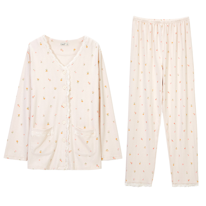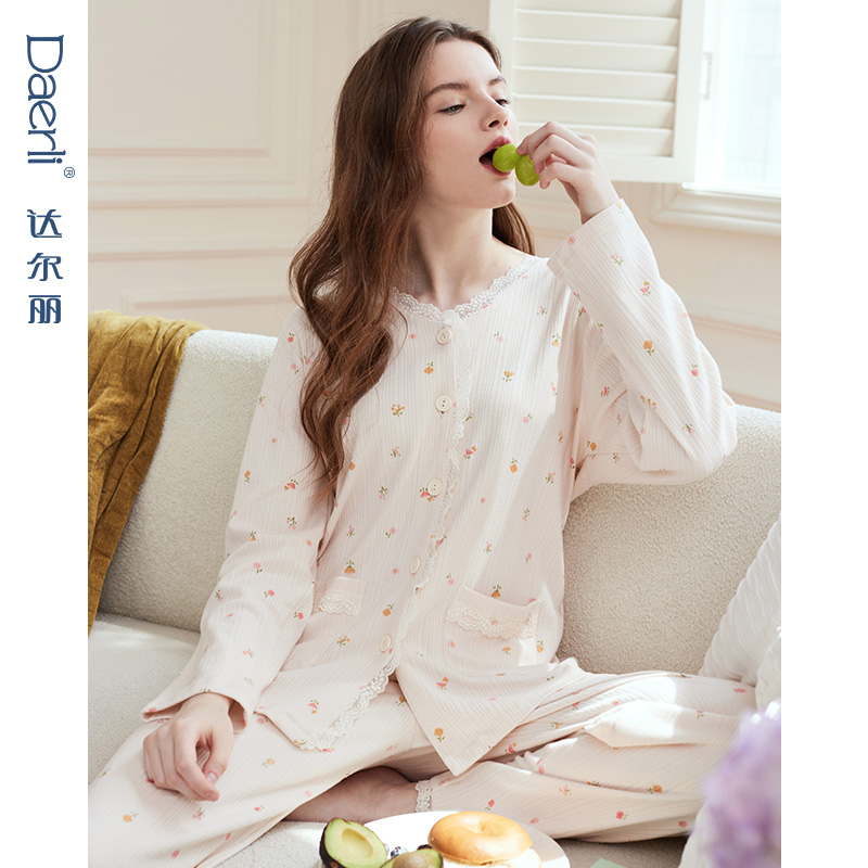 家居服女套装 达尔丽纯棉睡衣女秋款 V领蕾丝田园花款 长袖 2023新款