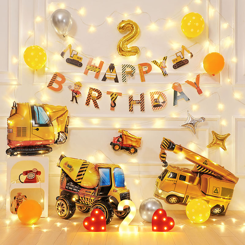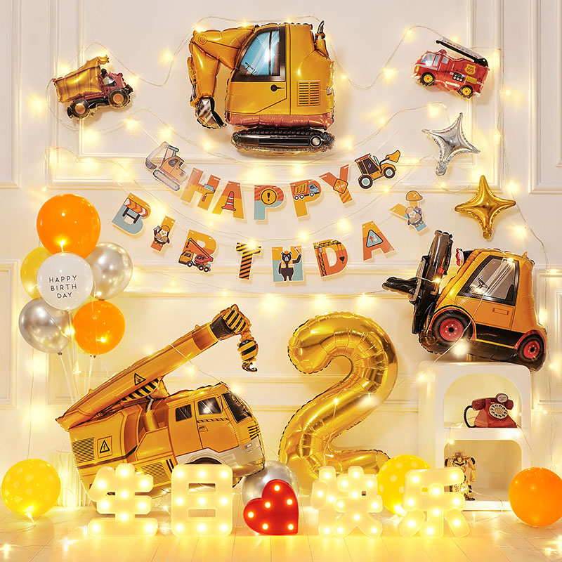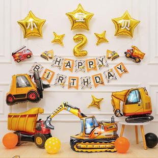 挖掘机汽车主题生日快乐场景布置3两岁男童装 饰男孩2岁气球工程车