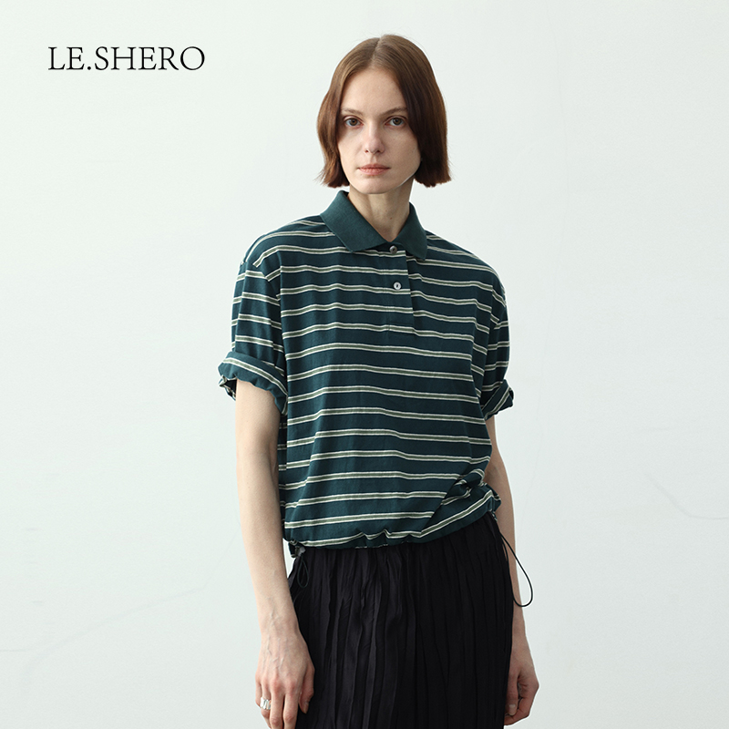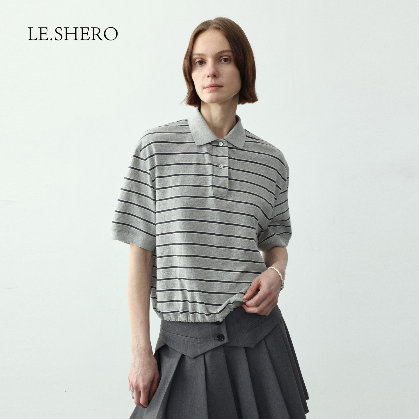 休闲百搭上衣 2025新款 LE.SHERO条纹抽绳下摆polo领短袖 t恤女夏季