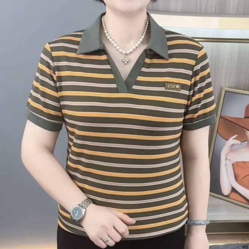 拼接短袖 条纹休闲时尚 妈妈上衣 T恤女士洋气减龄气质新款 2025夏季