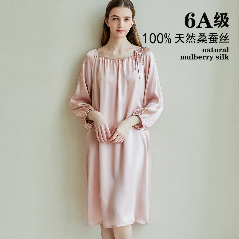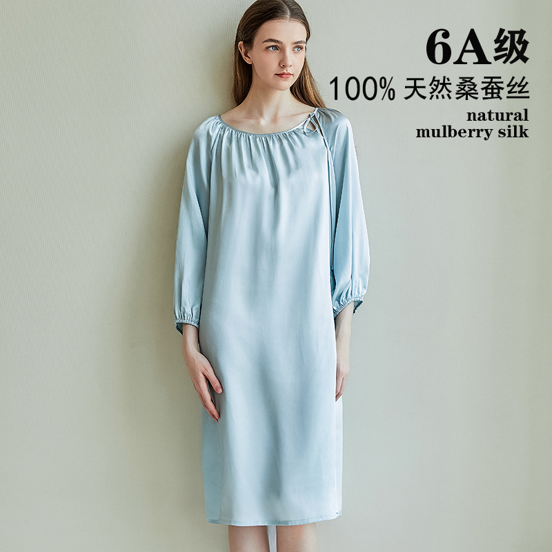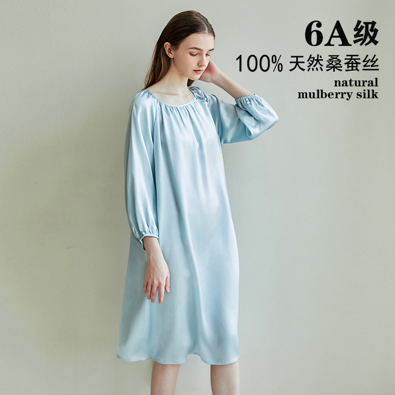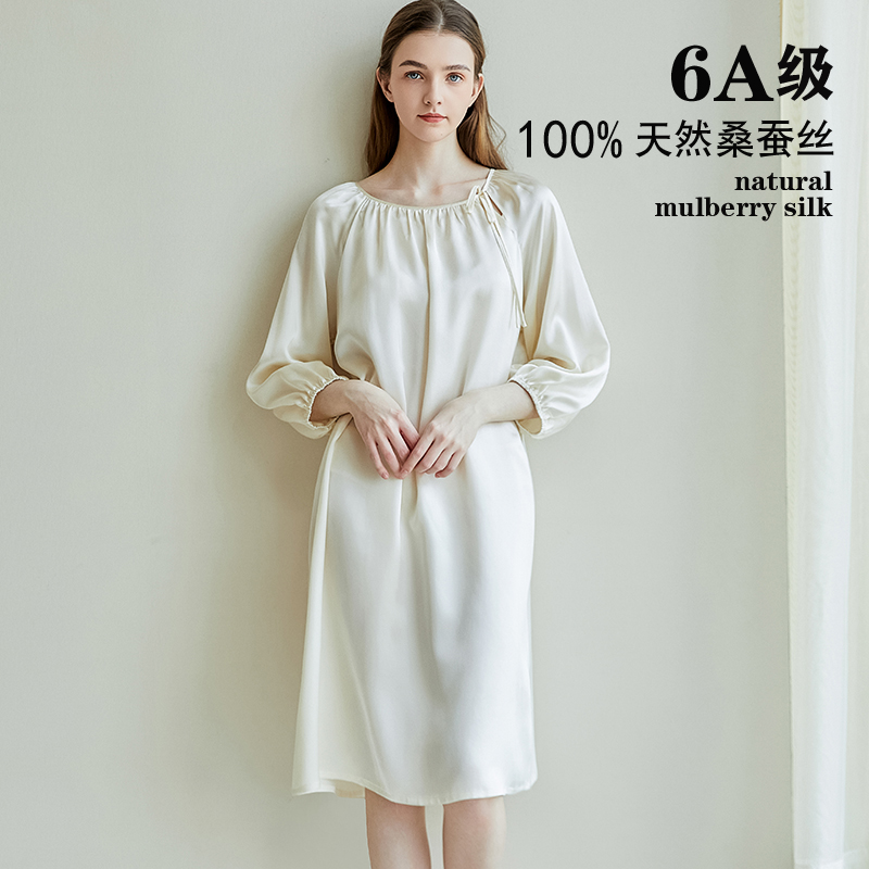 过膝盖100%桑蚕丝睡裙夏真丝家居服高档睡衣长款 高级奶白 洋气大码