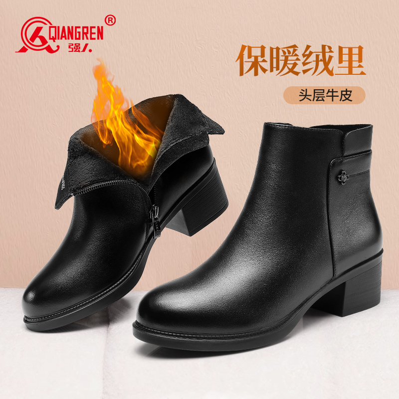 女 粗跟高跟中老年皮鞋 强人3515女鞋 真皮妈妈短靴秋冬女靴加绒棉鞋