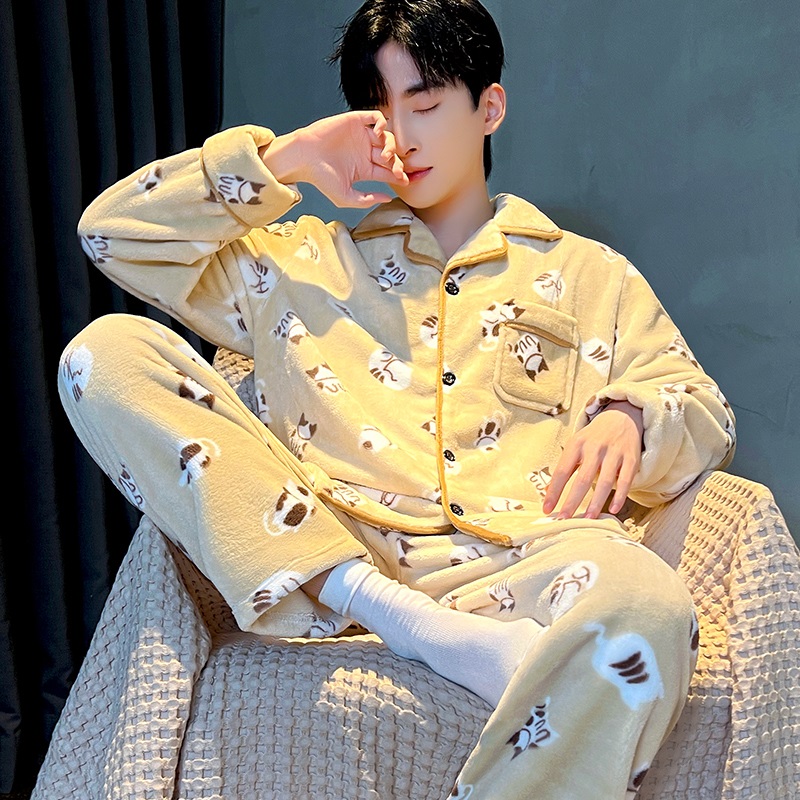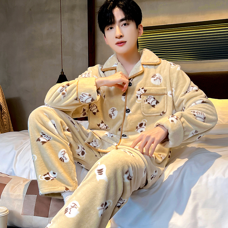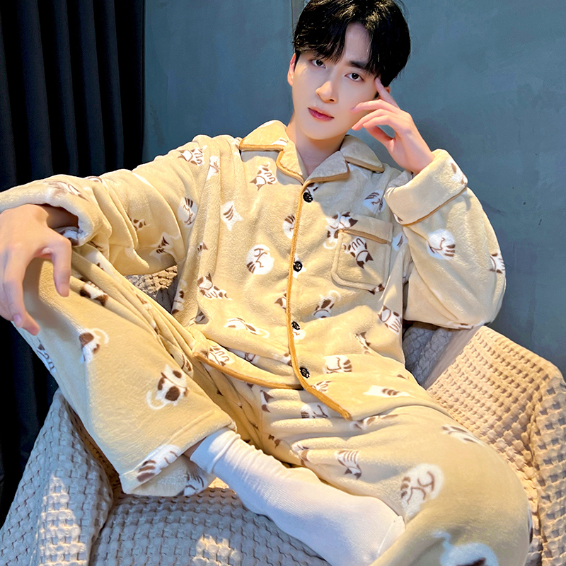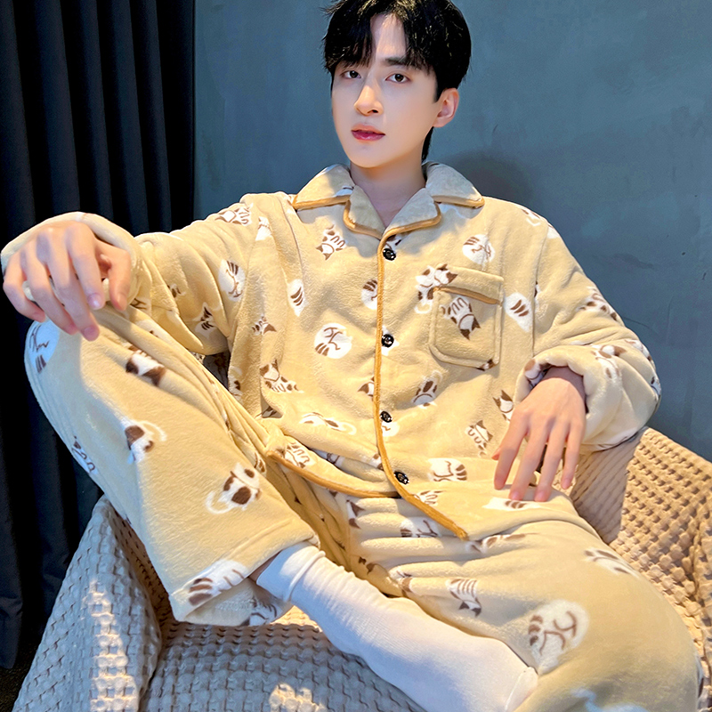 春秋大码 可外穿家居服保暖长袖 法兰绒 加厚珊瑚绒套装 睡衣男秋冬季