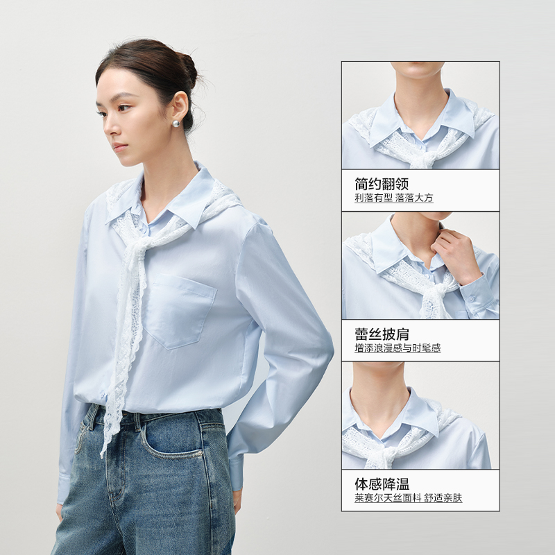 女长袖 小衫 夏季 上衣泡泡袖 2025新宽松设计感V领法式 蕾丝刺绣衬衫