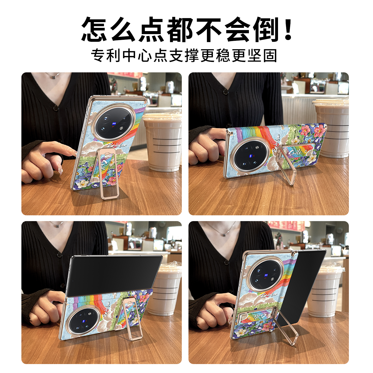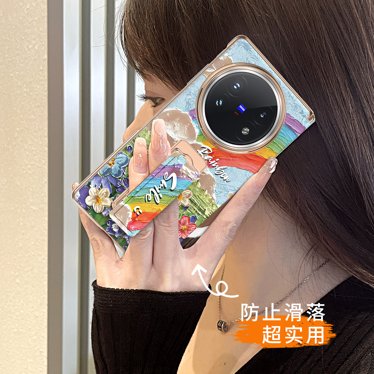 油画彩虹适用vivoxfold5手机壳新款 腕带支架XFold5磁吸全包中轴保护vivo折叠屏超薄x高档皮纹fold5防摔外壳套
