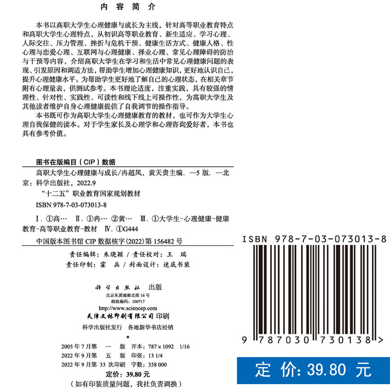 社9787030730138 十二五职业教育国家规划教材高等教育精品教材冉超凤黄天贵主编科学出版 现货高职大学生心理健康与成长 第五版