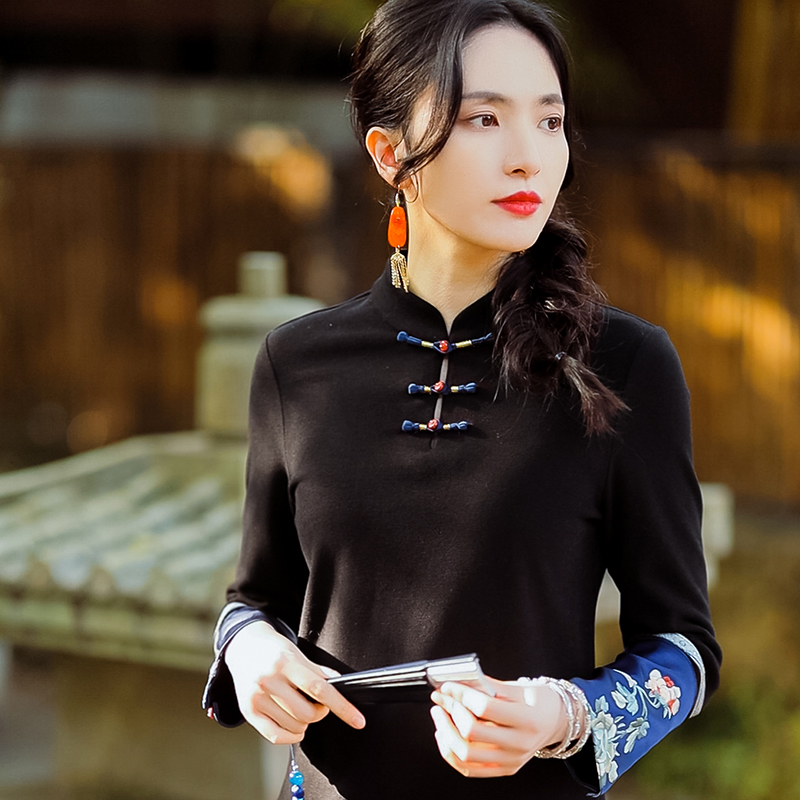 绣花打底T恤237T5145 女上衣国风气质长袖 复古日记新款 立领新中式