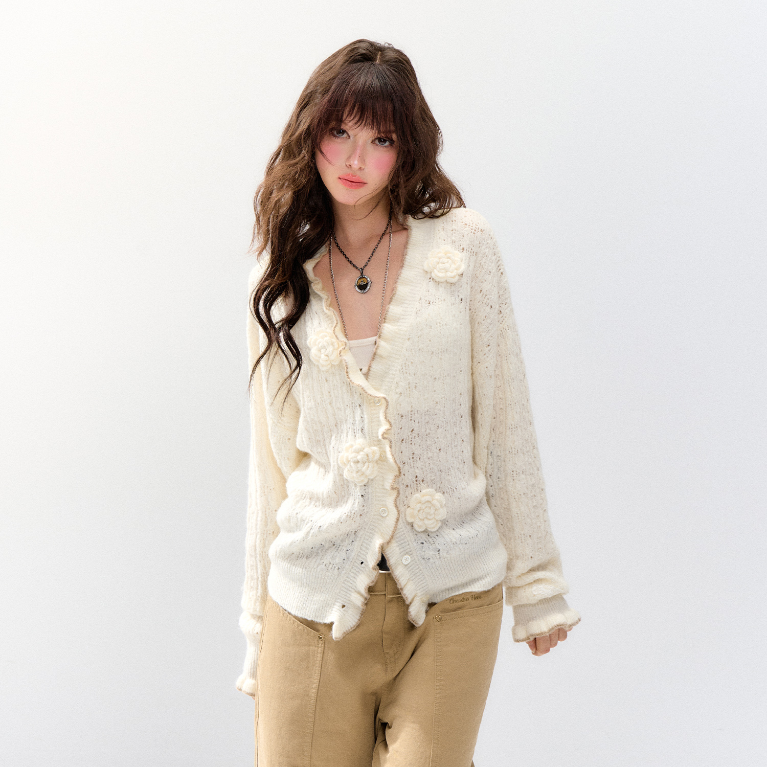 GUUKAHERO米白镂空V领落肩开衫 毛衣女秋韩系甜美柔软花边针织上衣