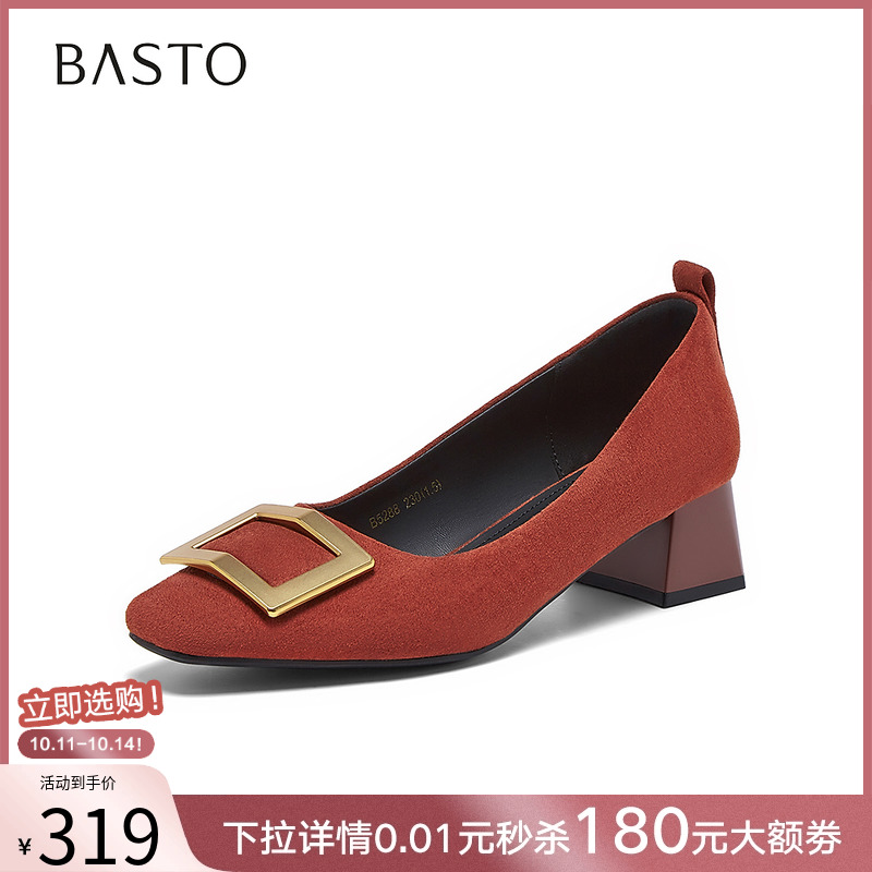 瓢鞋 方扣红色单鞋 百思图25秋新款 粗跟浅口女平底婚鞋 丝绒玫瑰