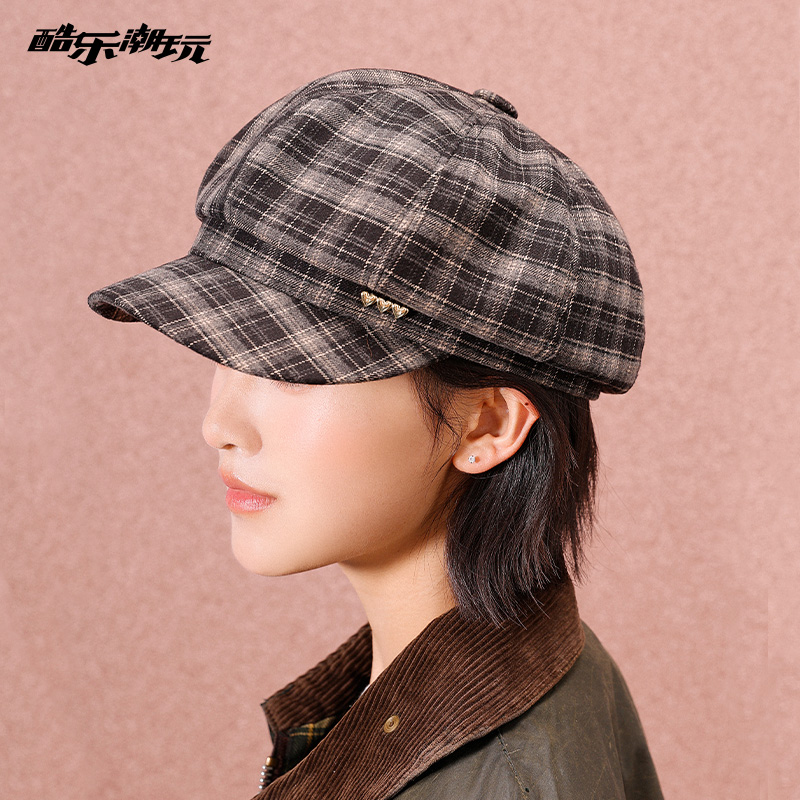 酷乐潮玩萌趣新复古八角帽麂皮格纹红棕圣诞小熊女报童帽蓓蕾帽冬