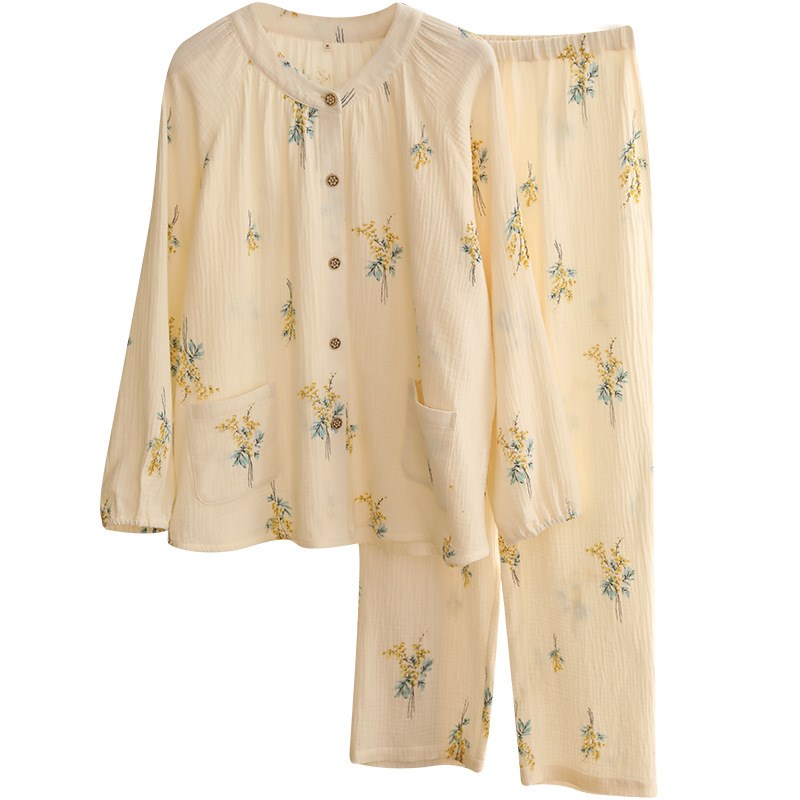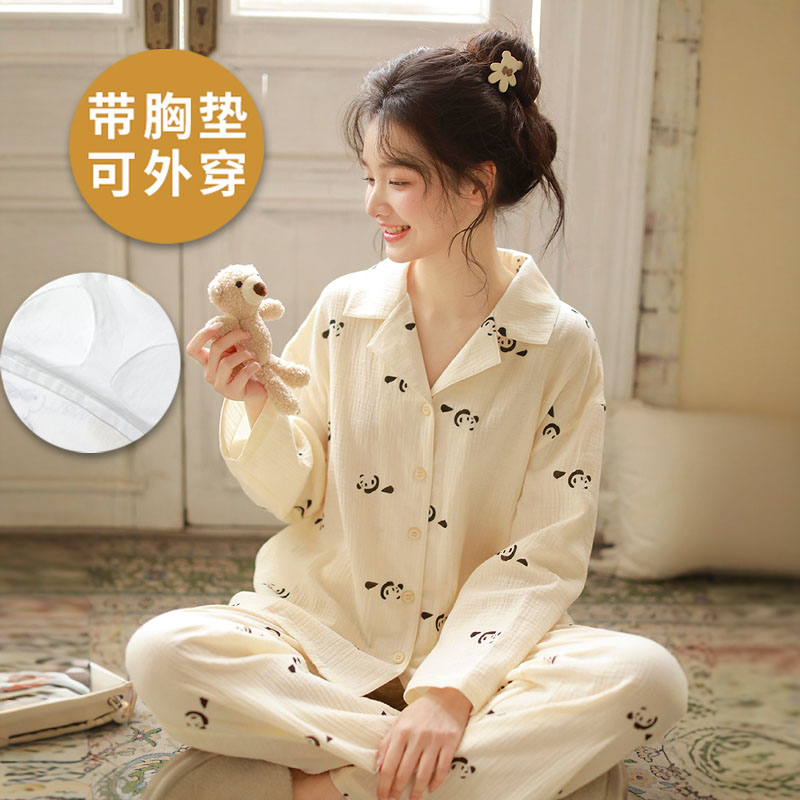 韩式 浪莎纯棉带胸垫睡衣女春秋季 薄款 长裤 家居服可外穿两件套 长袖