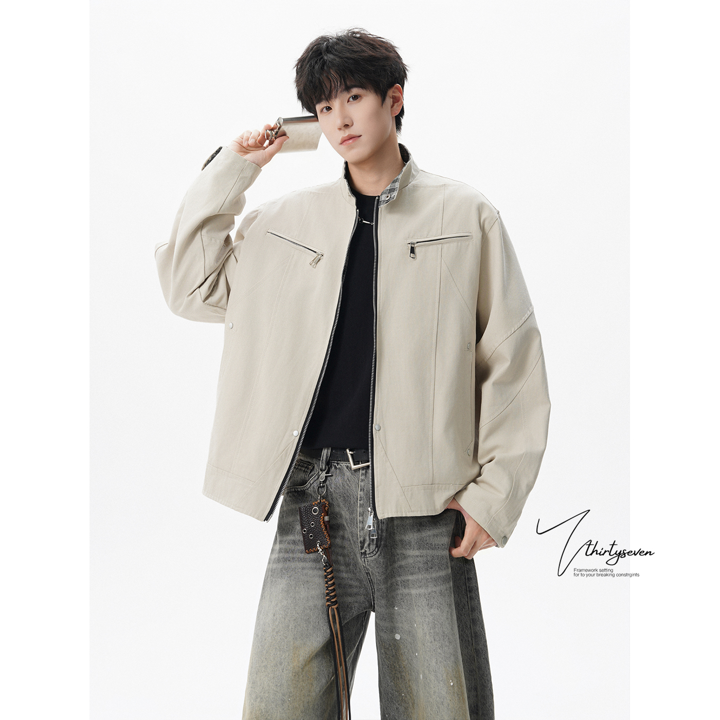 查尔斯桃心2025年新款 可拆卸连帽牛仔夹克男磨白单排扣多口袋外套