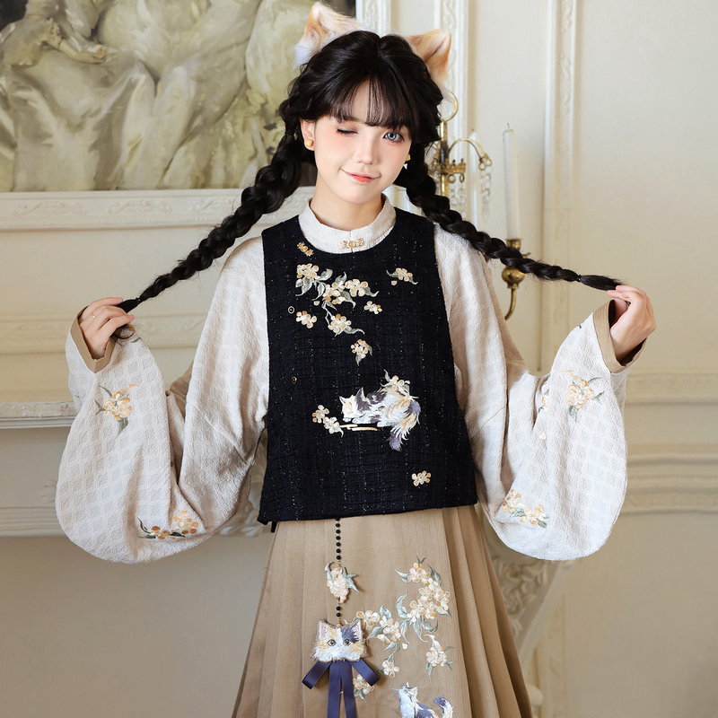 马面裙日常学院风套装 汉服女改良比甲新中式 秋 三花猫 汉尚华莲