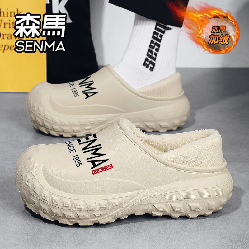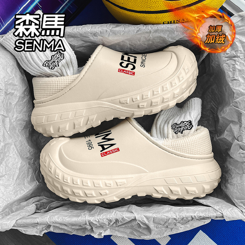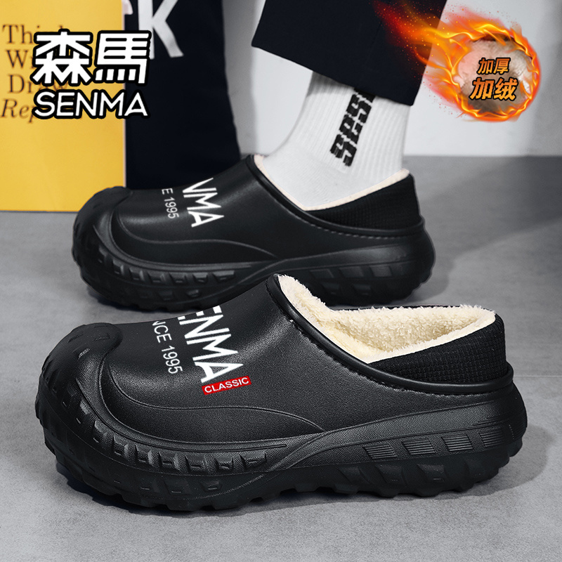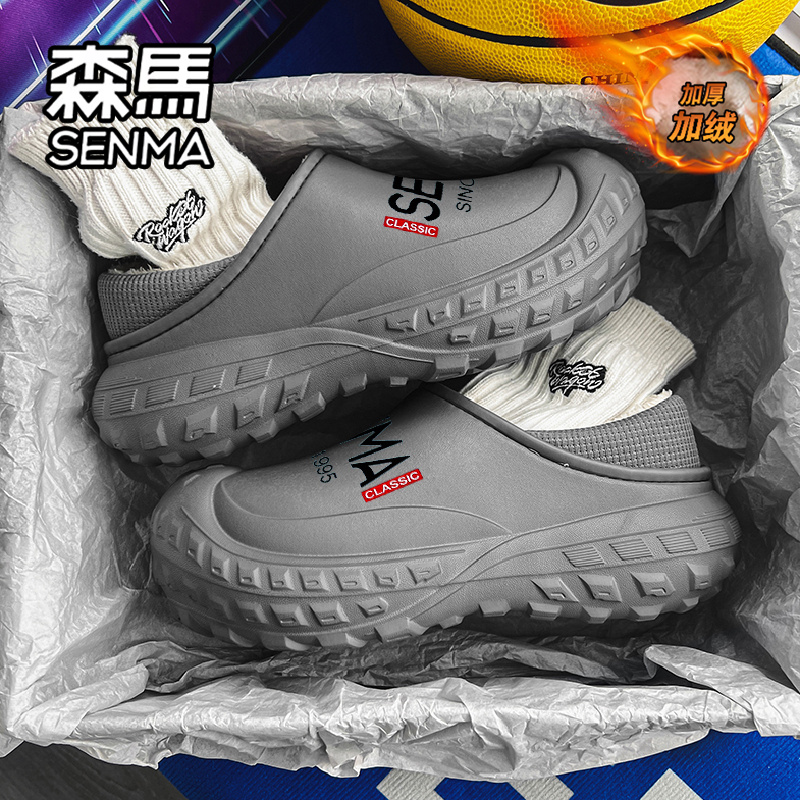 外穿防水防滑厚底拖鞋 森马棉拖鞋 男士 加绒加厚保暖包跟棉鞋 男冬季