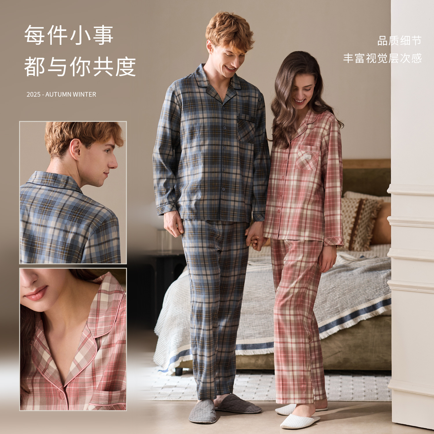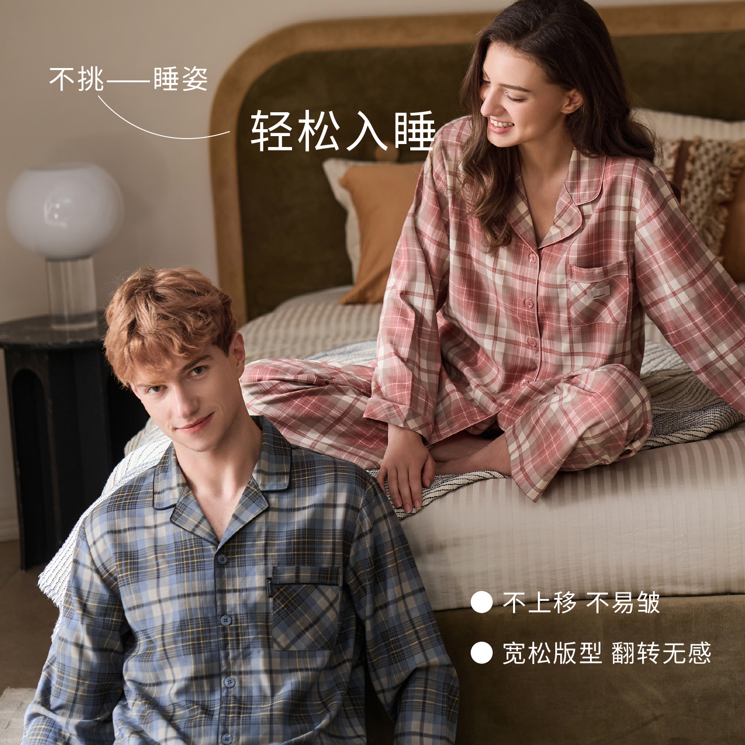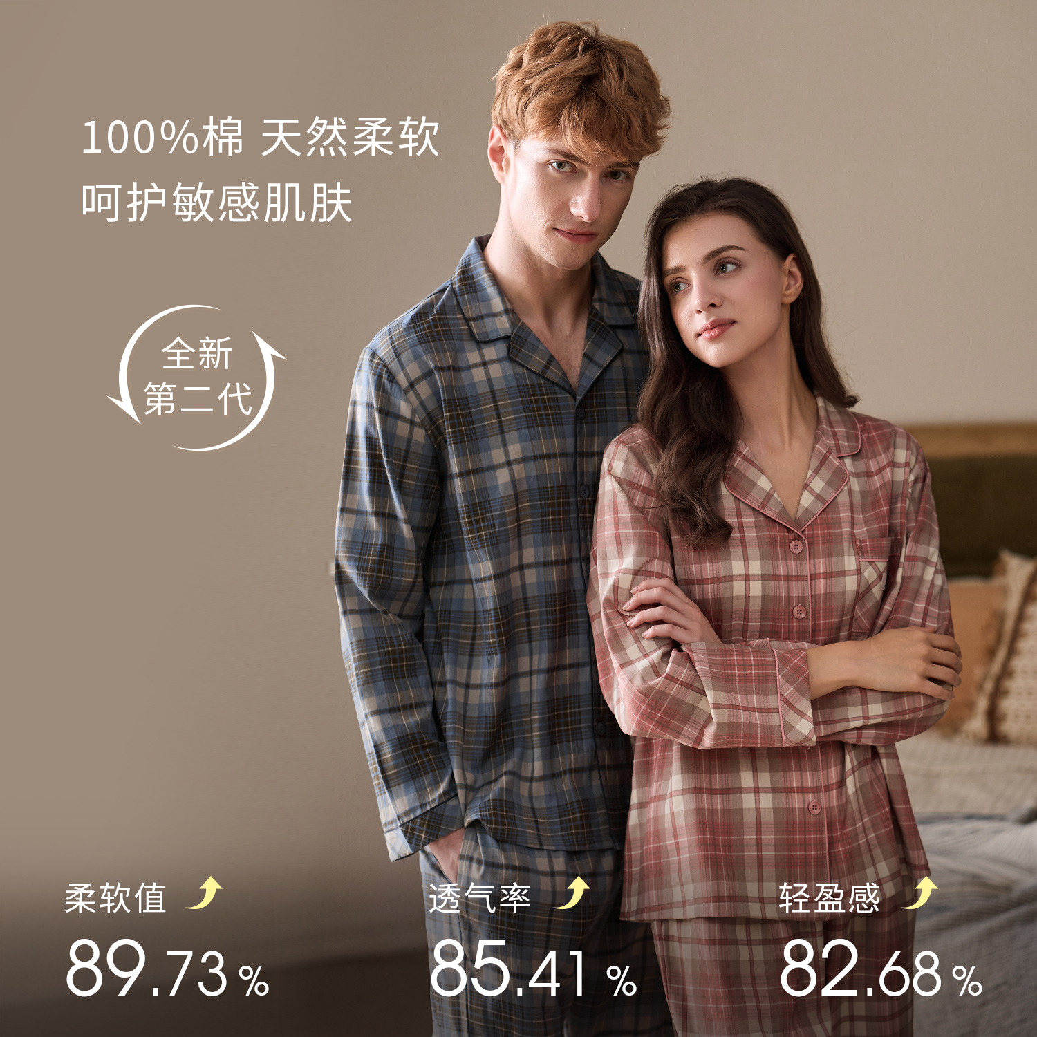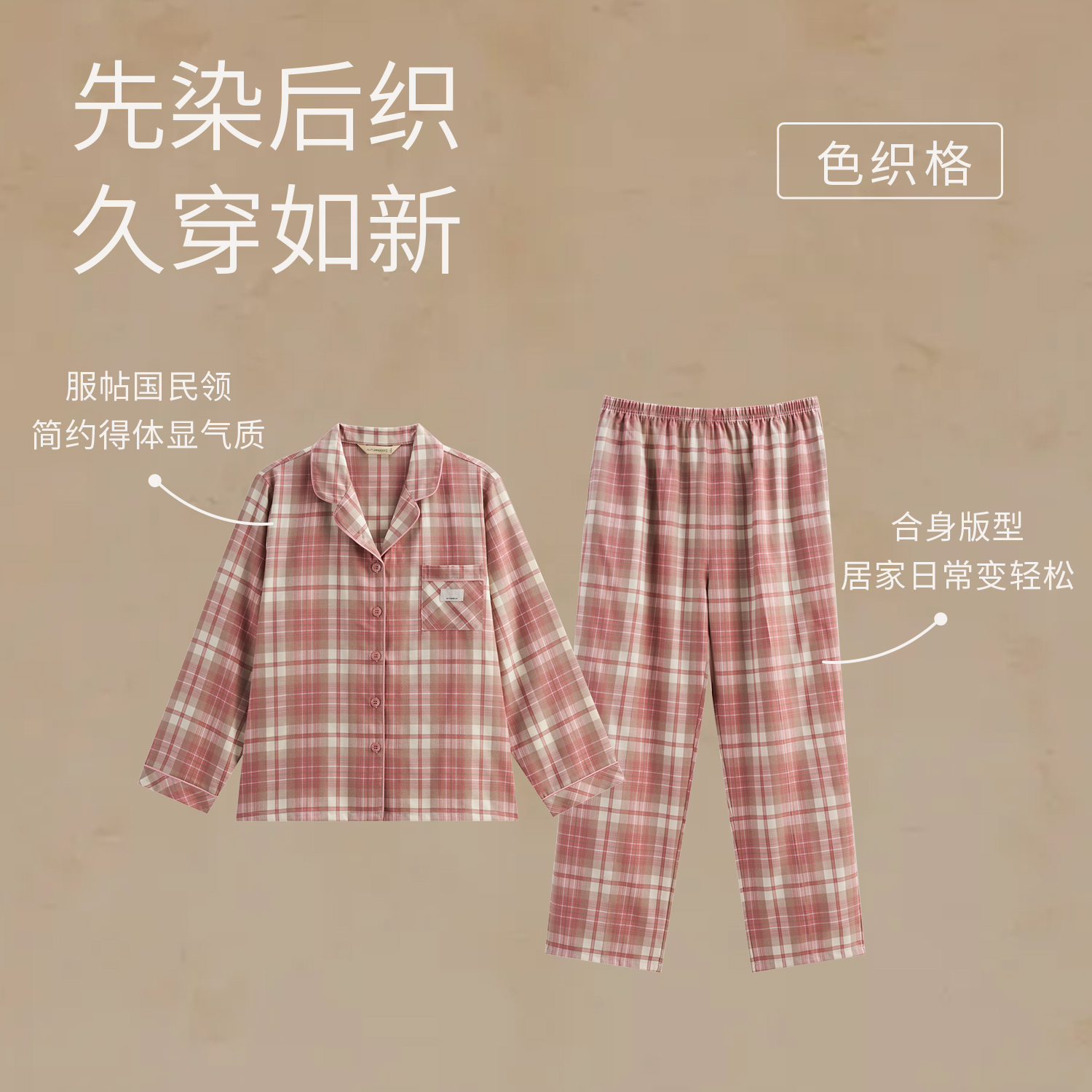 色织家居服套装 秋鹿情侣睡衣女纯棉秋季 5A抑菌柔软舒适格纹长袖