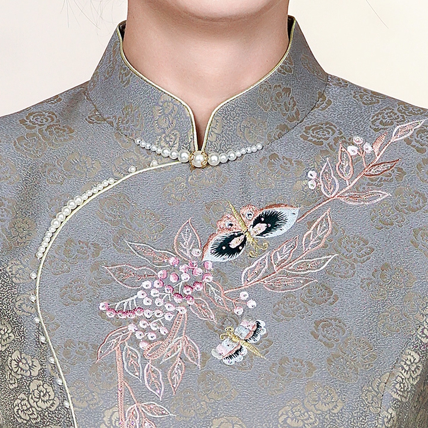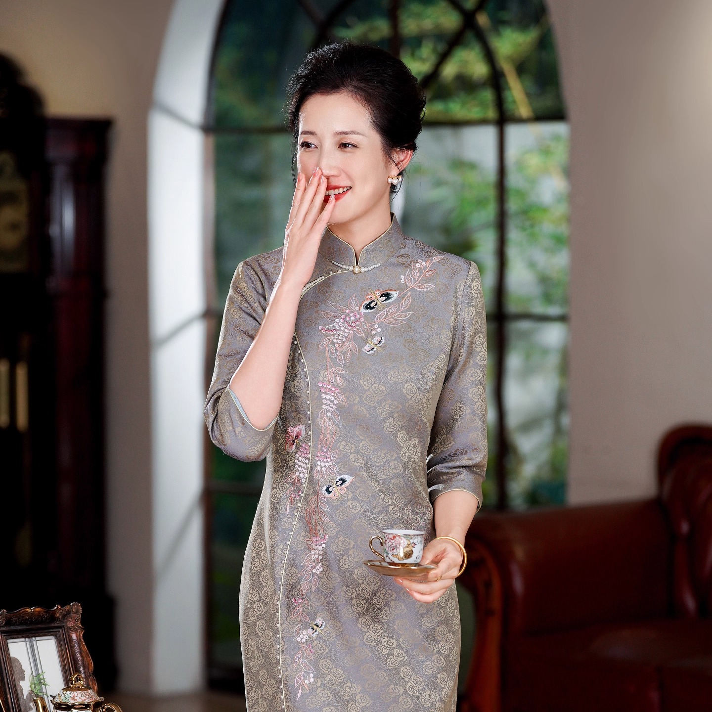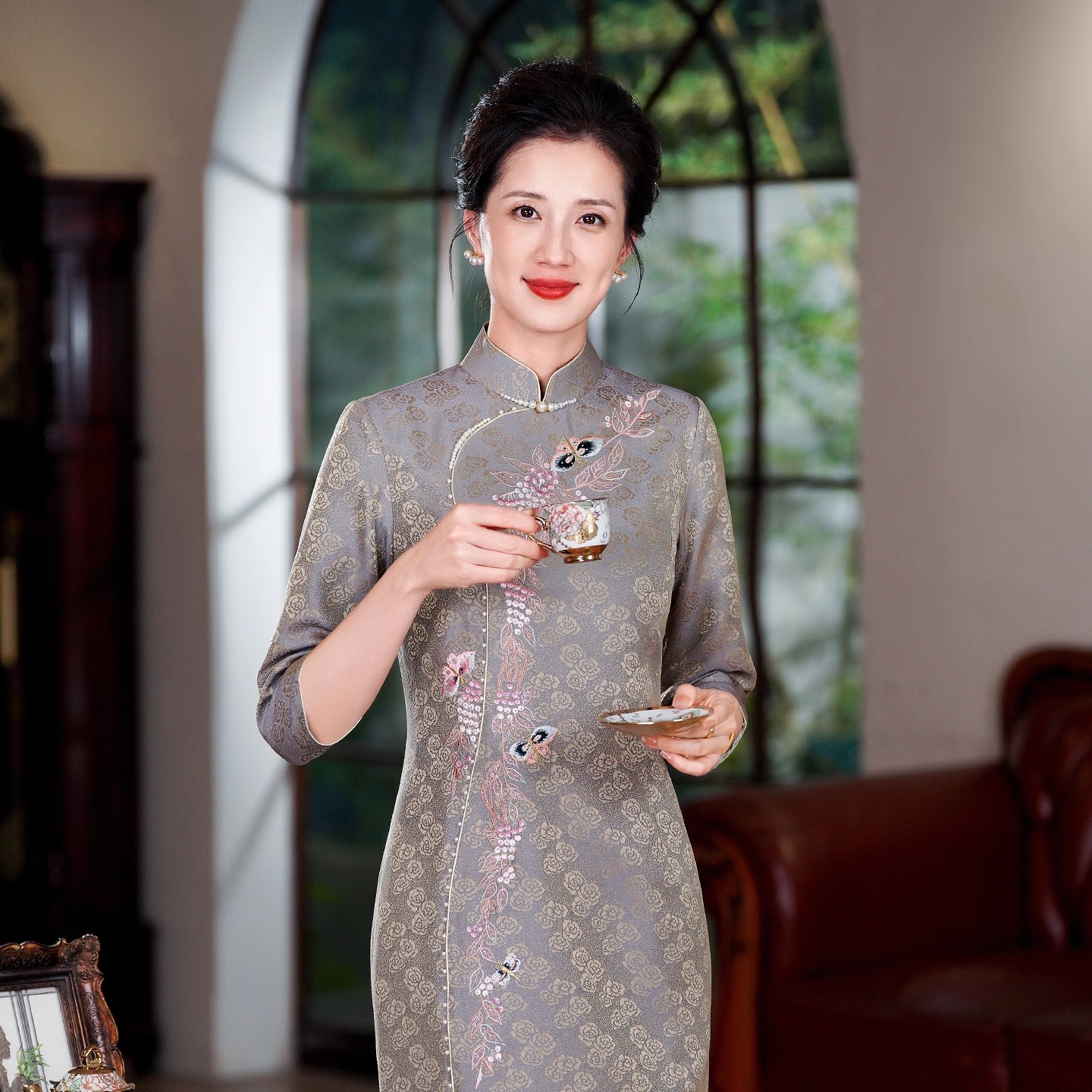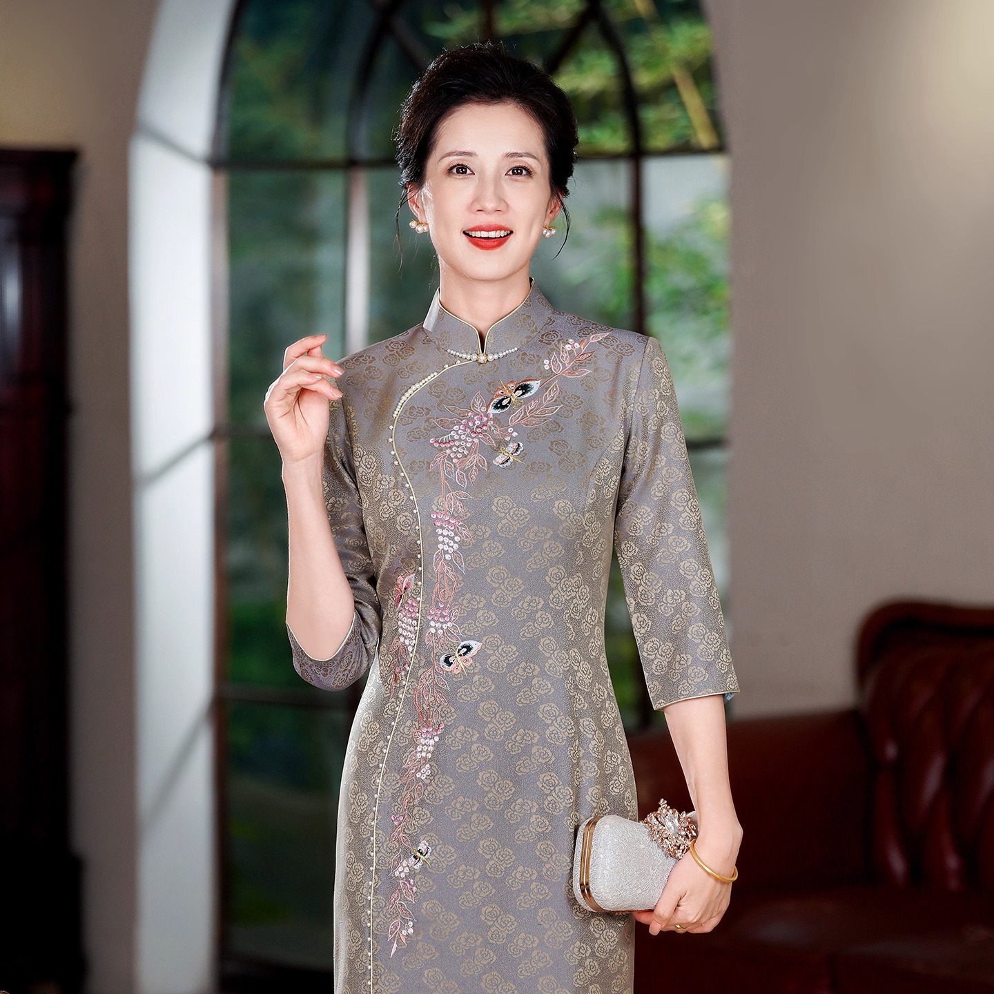 中长款 7分袖 旗袍 真丝刺绣旗袍喜妈妈婚宴气质高档礼服秋季 2025款