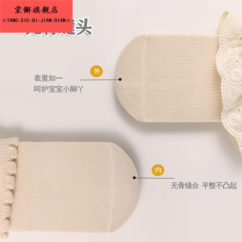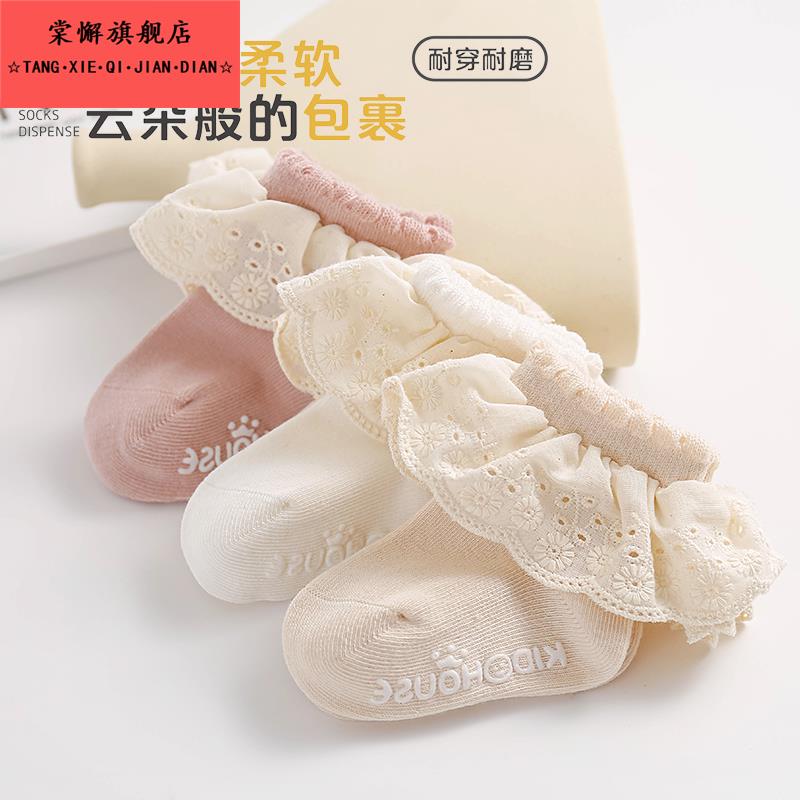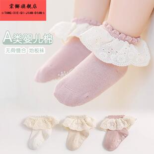 婴儿袜子春秋季 纯棉女宝宝公主无骨中筒地板松口防滑花边袜松口袜
