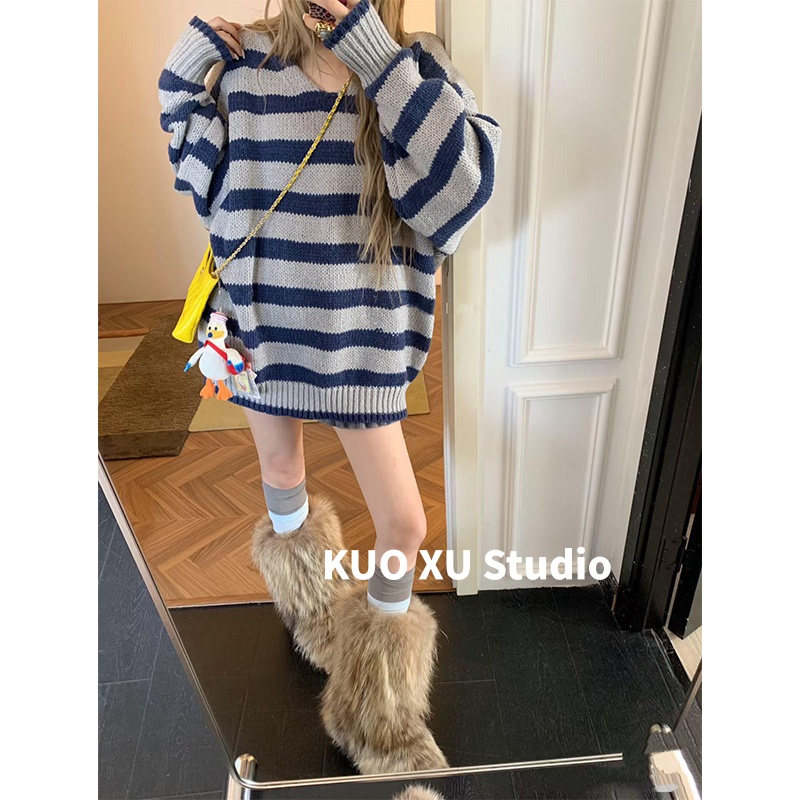 上衣女 针织衫 早秋穿搭韩版 通勤甜辣妹V领条纹毛衣慵懒宽松中长款