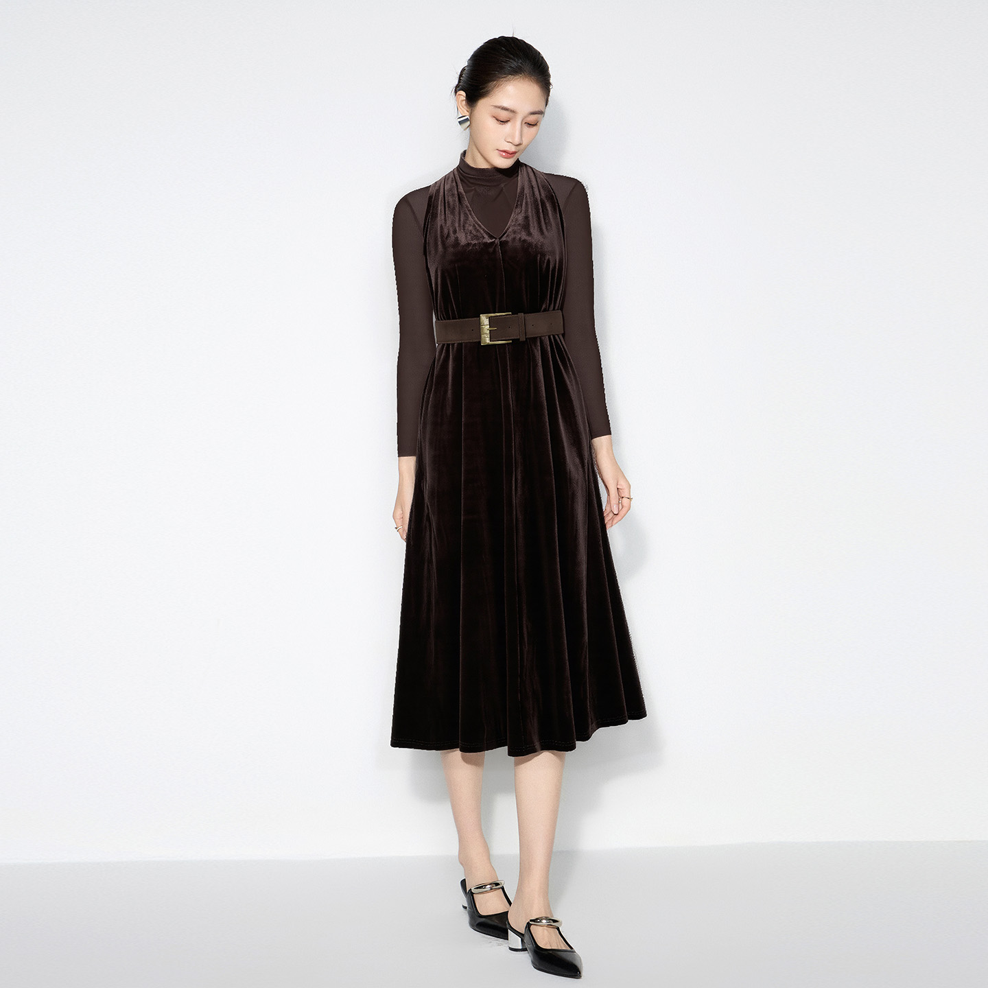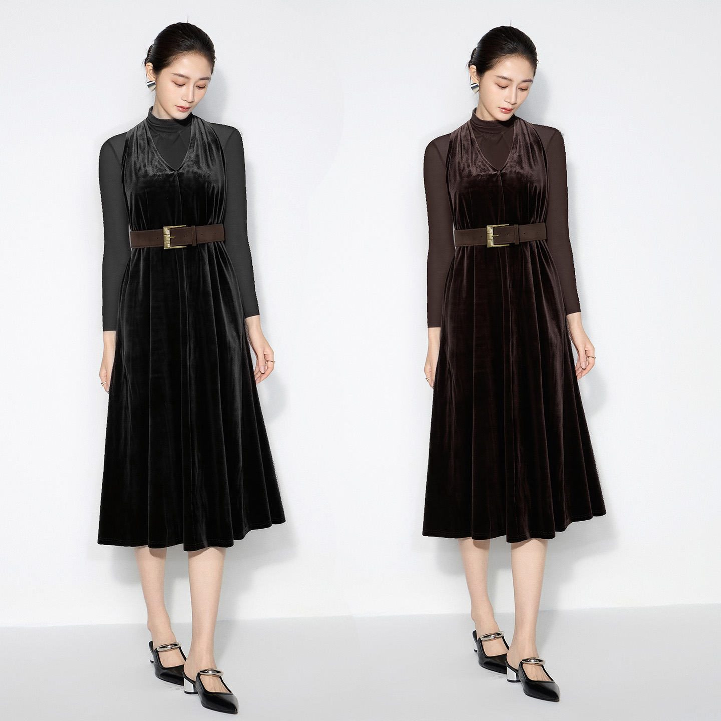 丝绒挂脖连衣裙子收腰两件套装 打底衫 高领修身 马天奴2025秋冬新款
