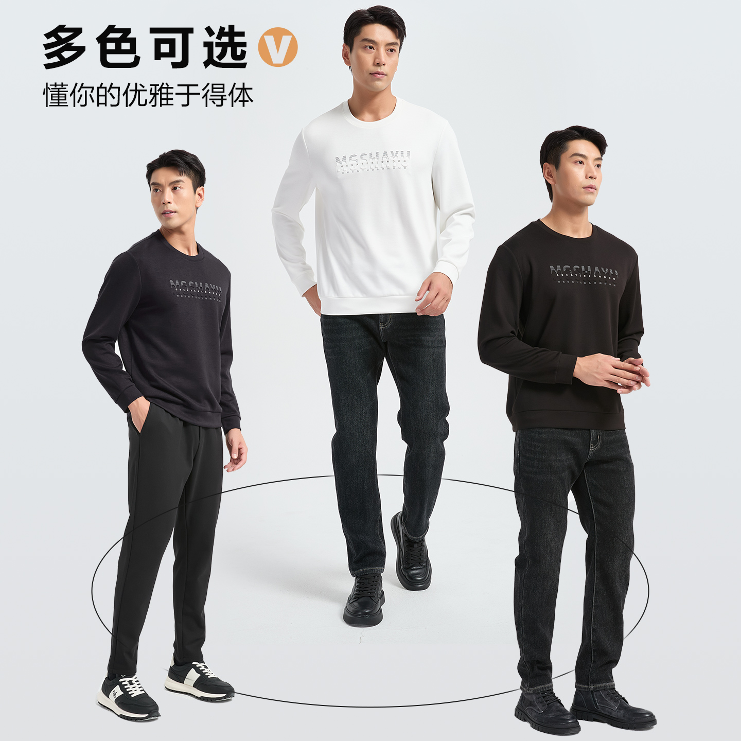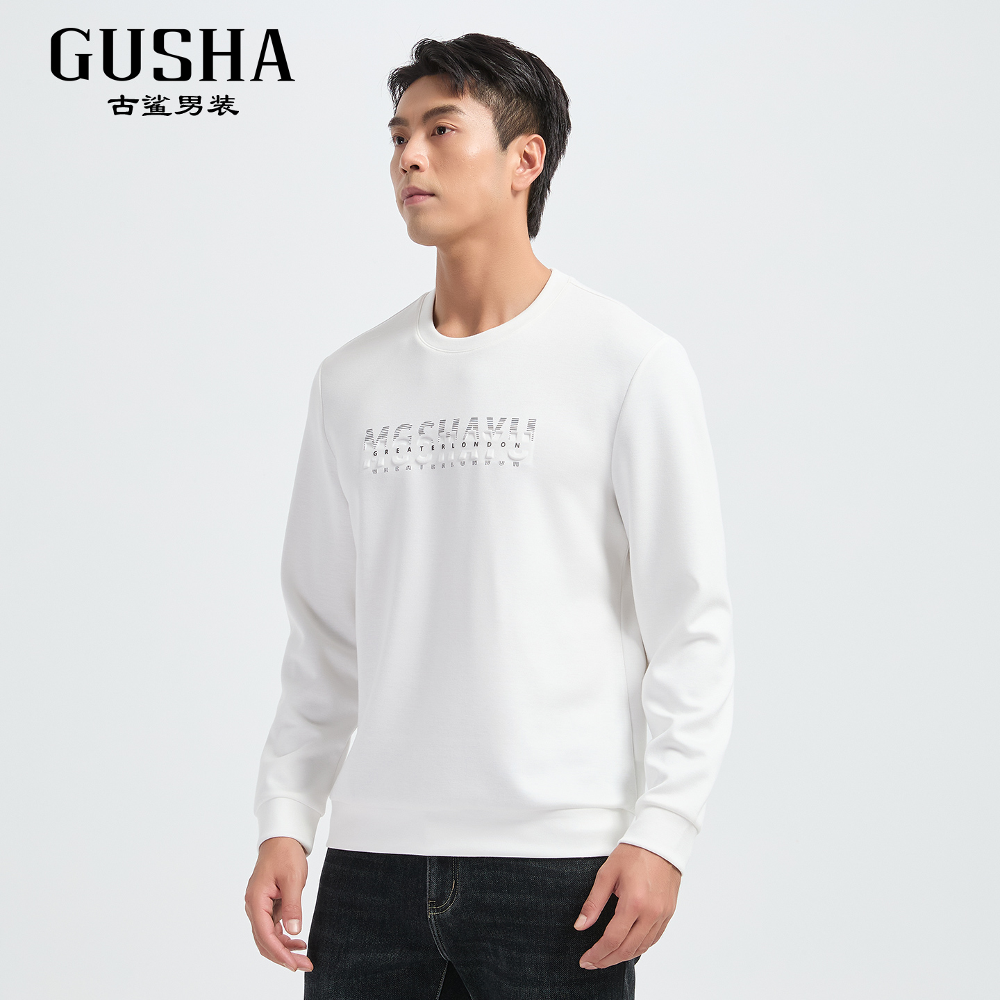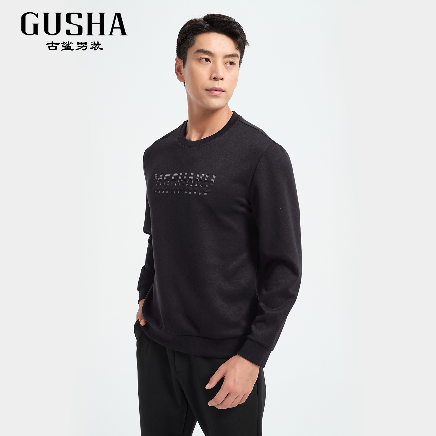 T恤2025秋装 古鲨黑色绵羊毛卫衣男 字母立体印花圆领柔软百搭长袖