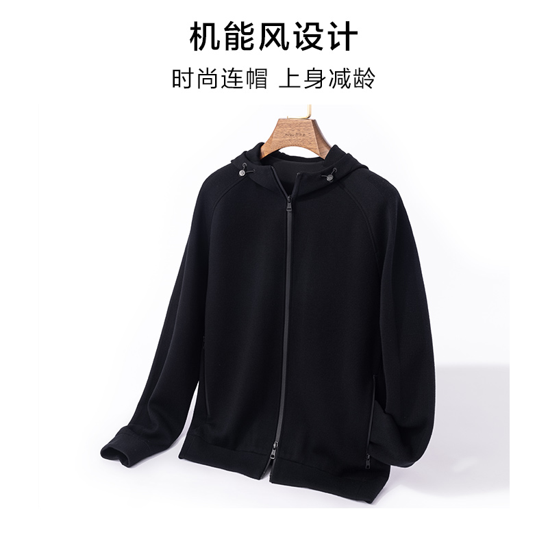 保暖PT16773 黑色机能风插肩长袖 布先生轻奢羊毛外套连帽开衫 男款