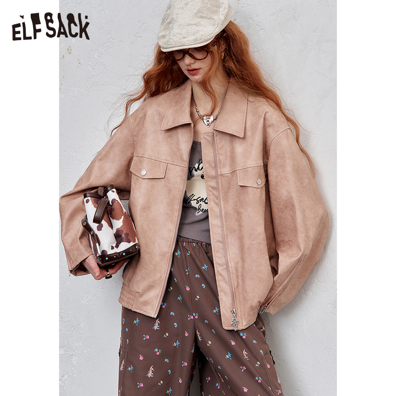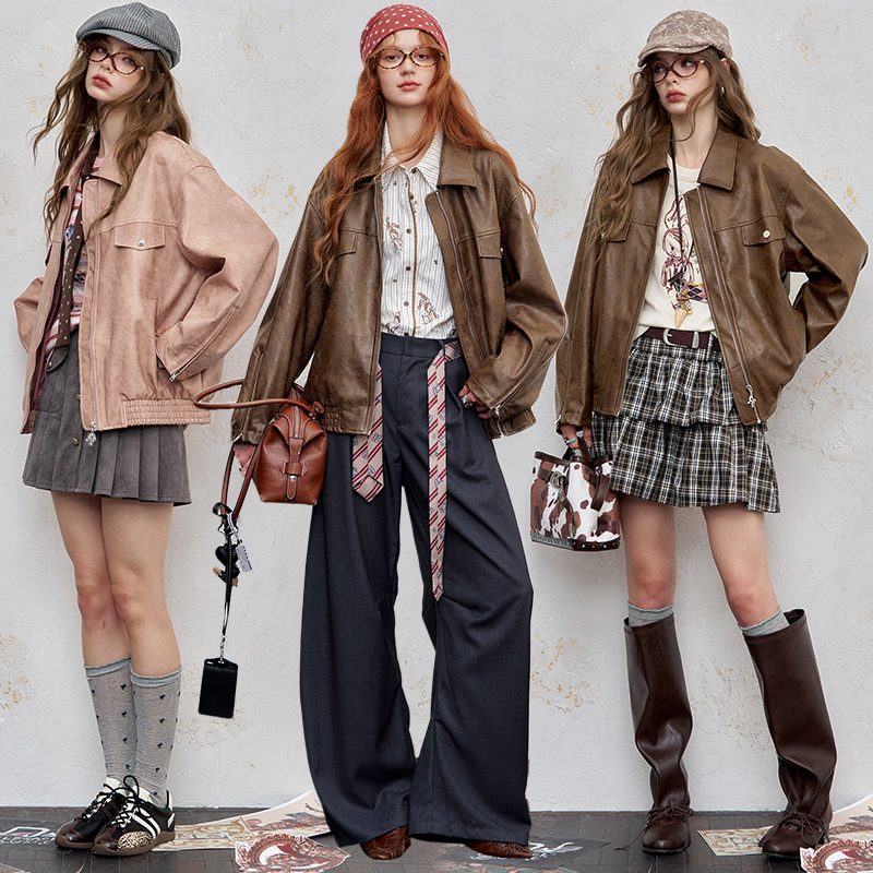 宽松甜酷机车皮衣 新款 妖精 口袋复古咖棕PU皮外套女2025年秋季