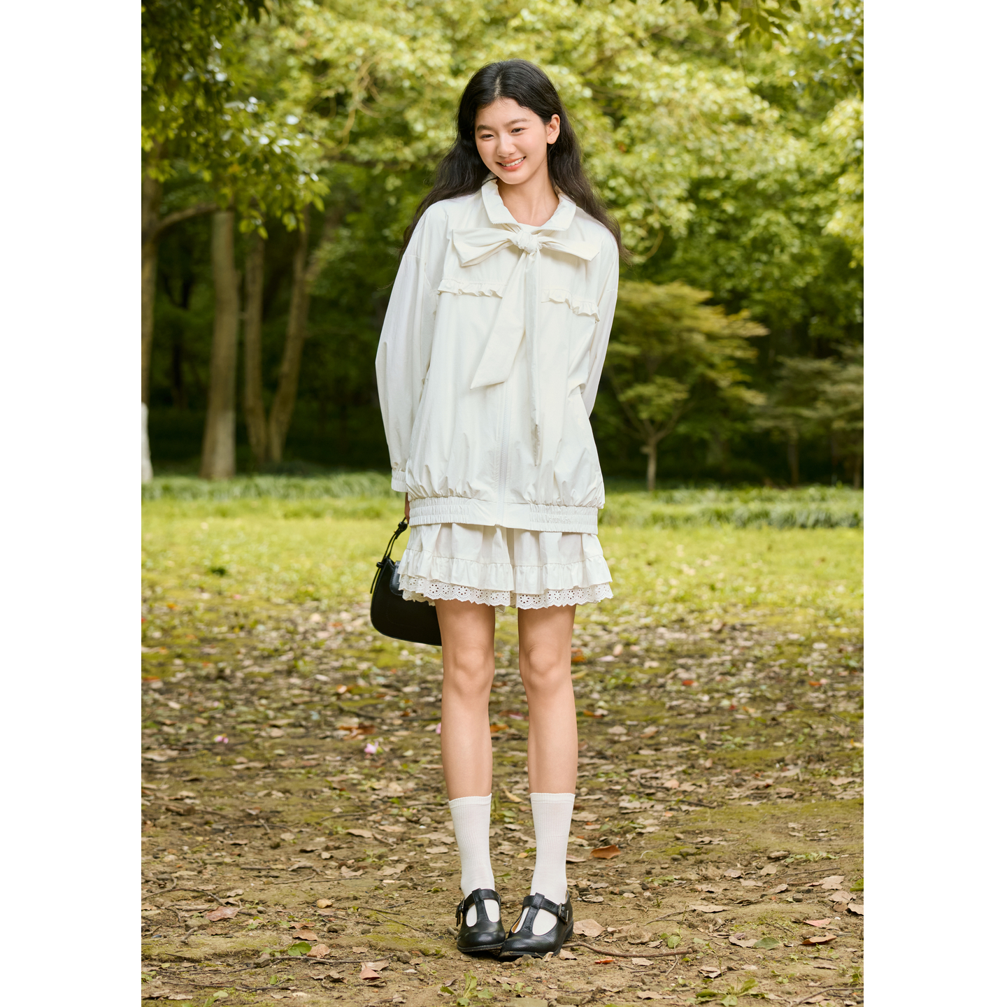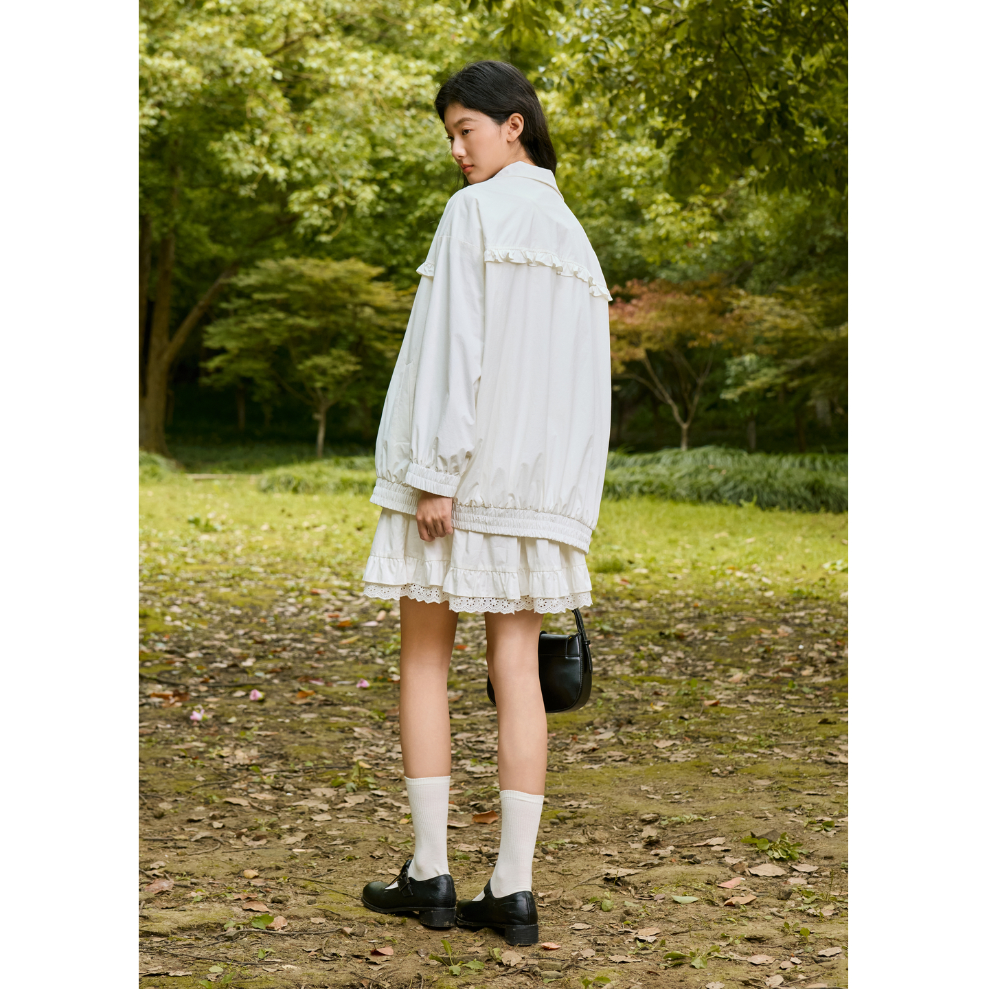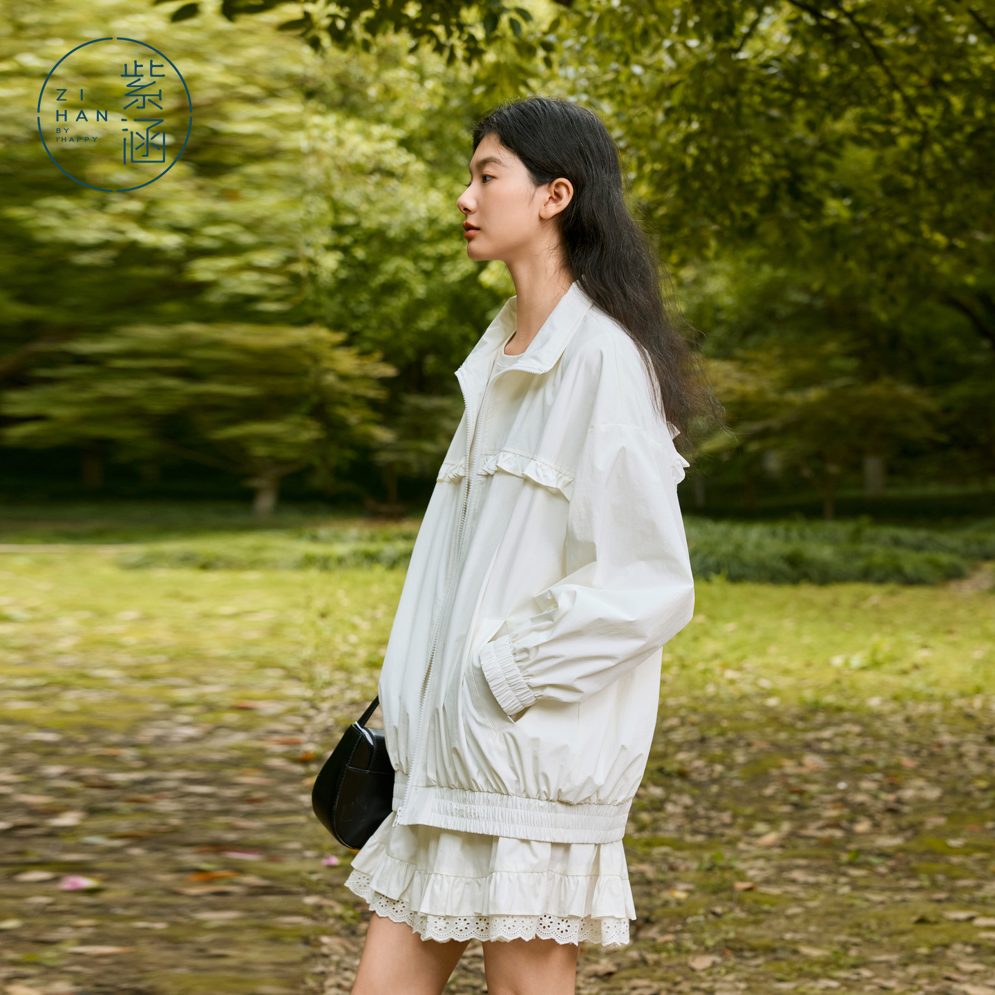 紫涵白色立领短外套女2025秋季 户外简约通勤花边拼接拉链上衣 新款