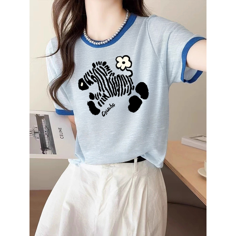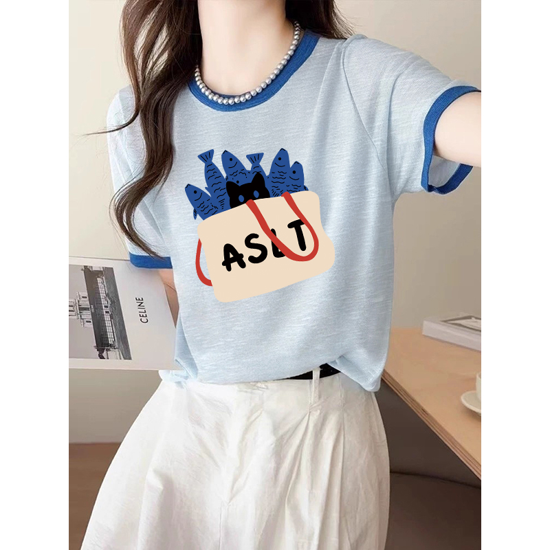 女装 宽松休闲大码 撞色超火减龄上衣设计感小众 t恤女2025新款 短袖