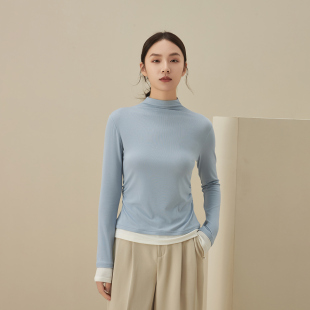 半高领长袖 撞色假两件T恤韩系早秋莫代尔上衣 女士内搭收腰打底衫