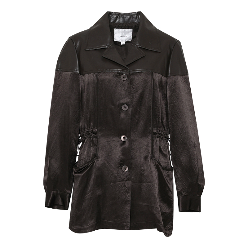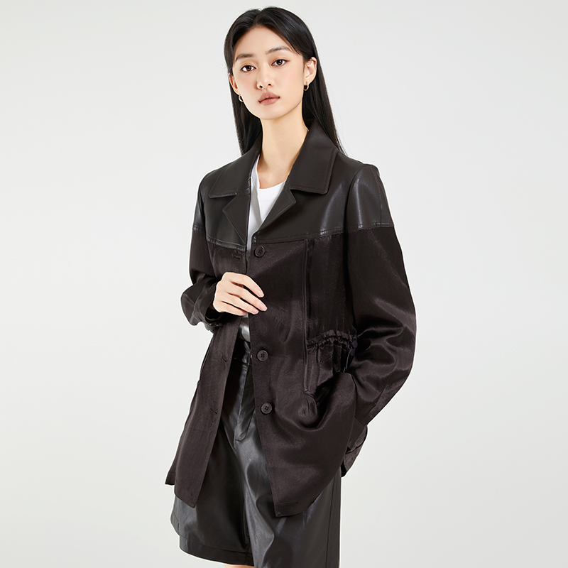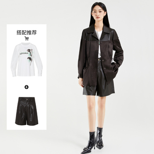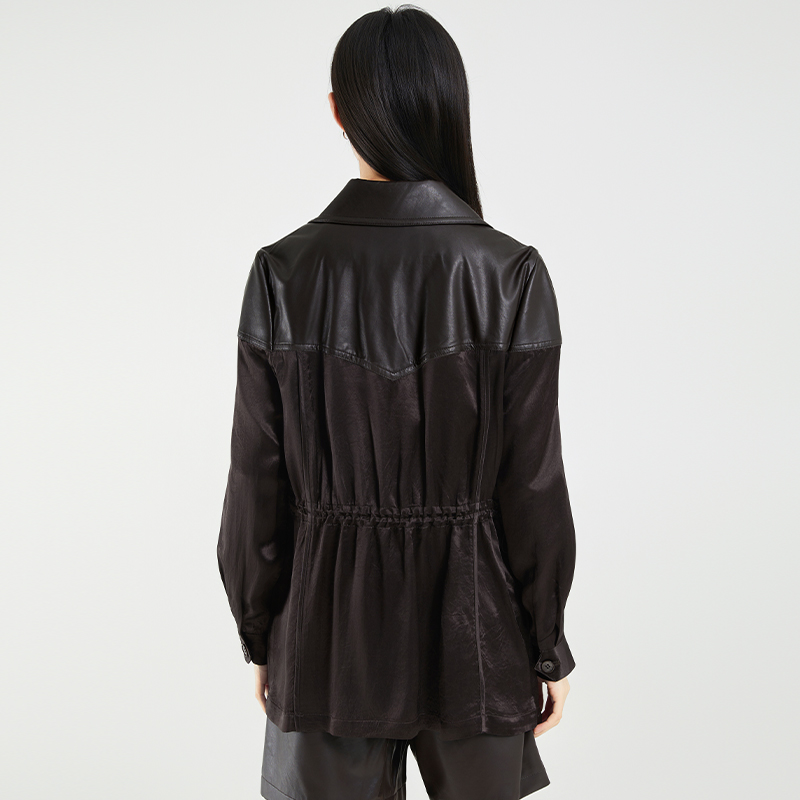 抽绳收腰皮夹克上衣百搭秋装 傲丝度拼接长袖 新款 外套2025女装 衬衫