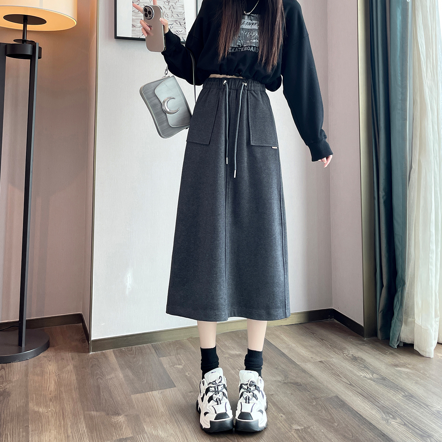 休闲毛呢半身裙女秋冬2025新款 高腰显瘦抽绳后开叉A字百搭中长裙