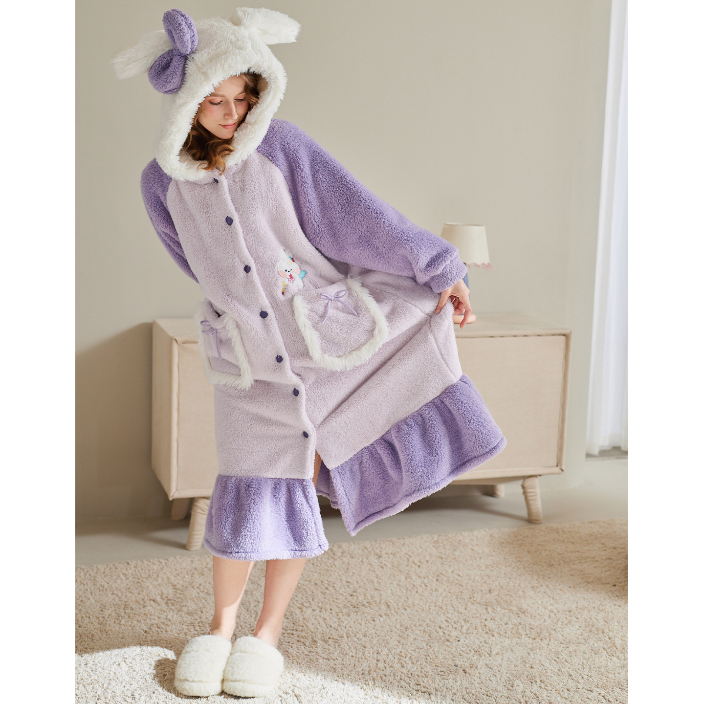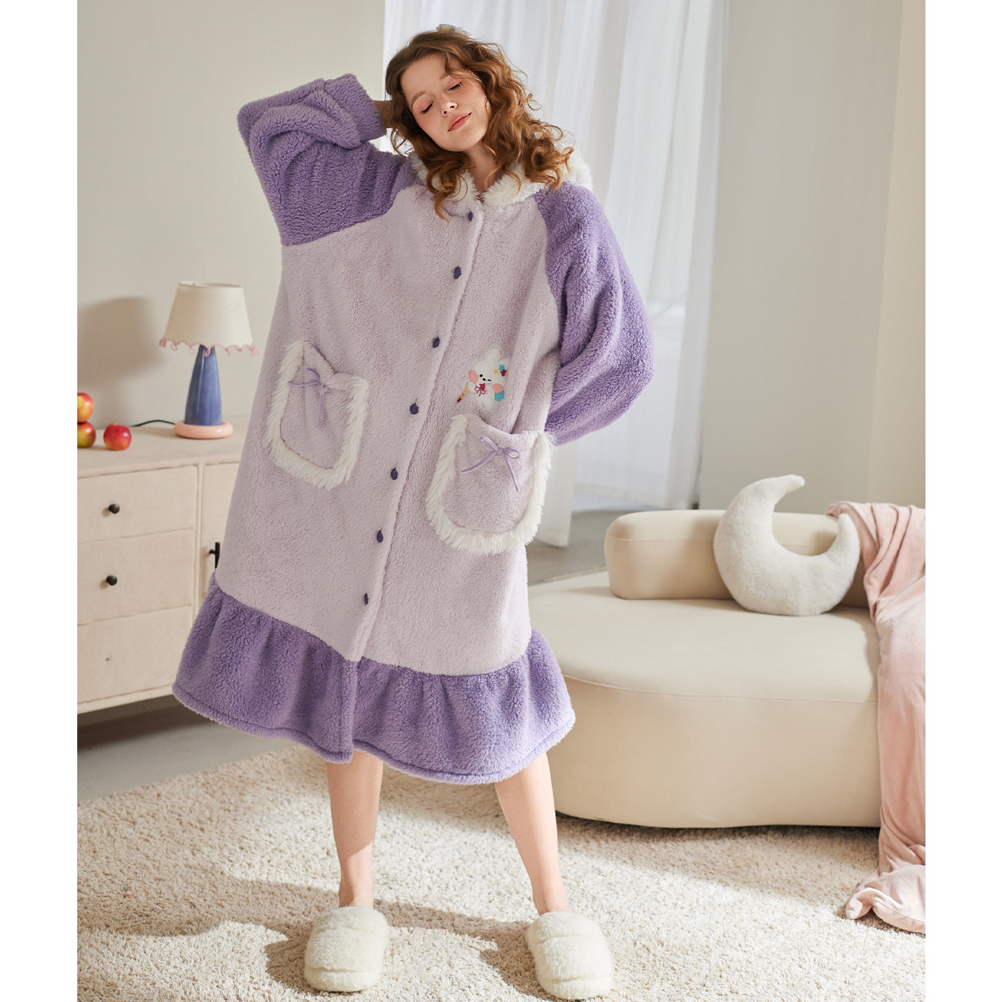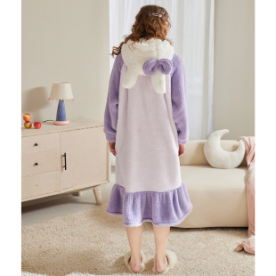 芬腾珊瑚绒睡袍连帽睡衣女秋冬季 睡裙家居服 可爱布朗熊法兰绒大码