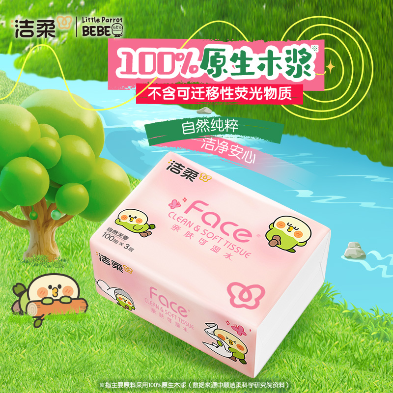 洁柔抽纸小鹦鹉100抽家庭囤货装 抽纸面巾纸可湿水纸巾 抽取式