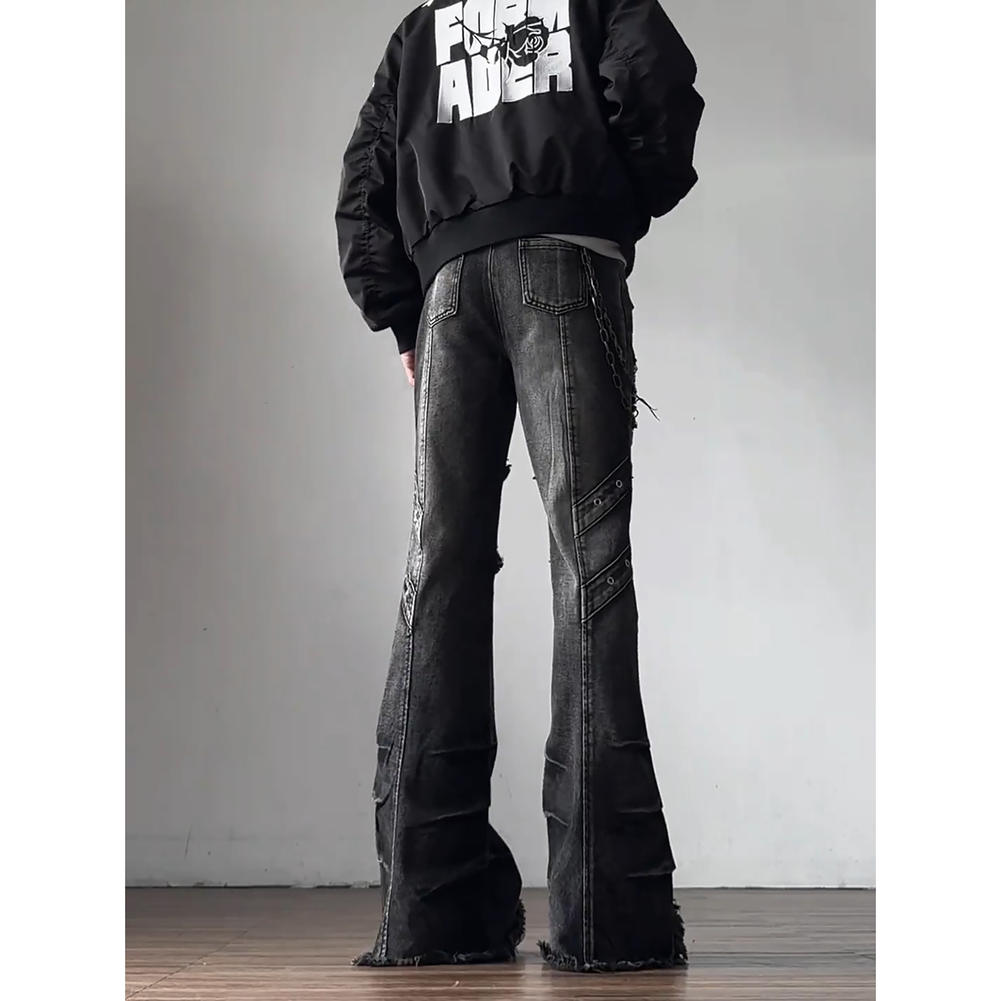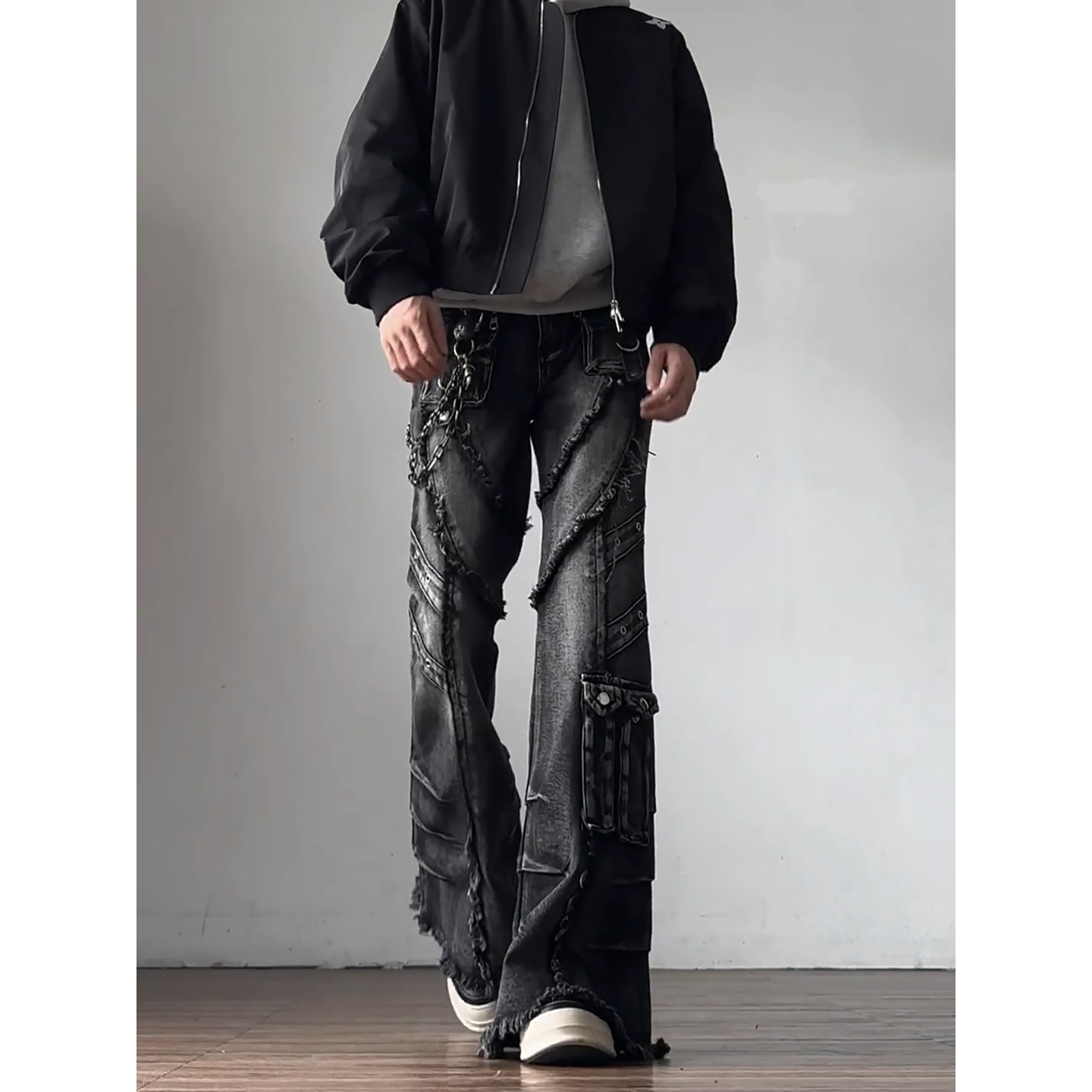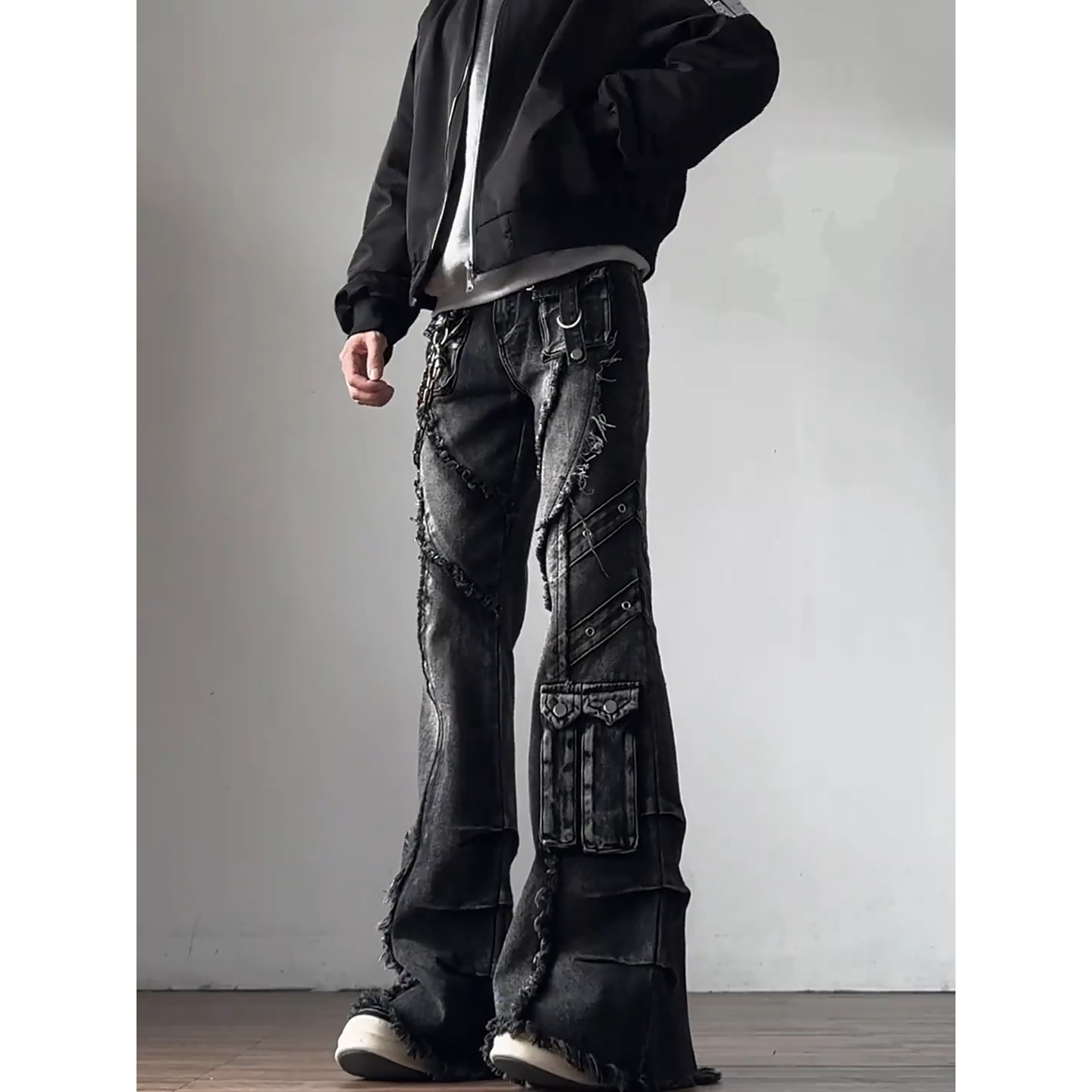 直筒显瘦亚比微喇裤 子男多口袋铆钉拼接毛边牛仔裤 高街vibe裤 美式