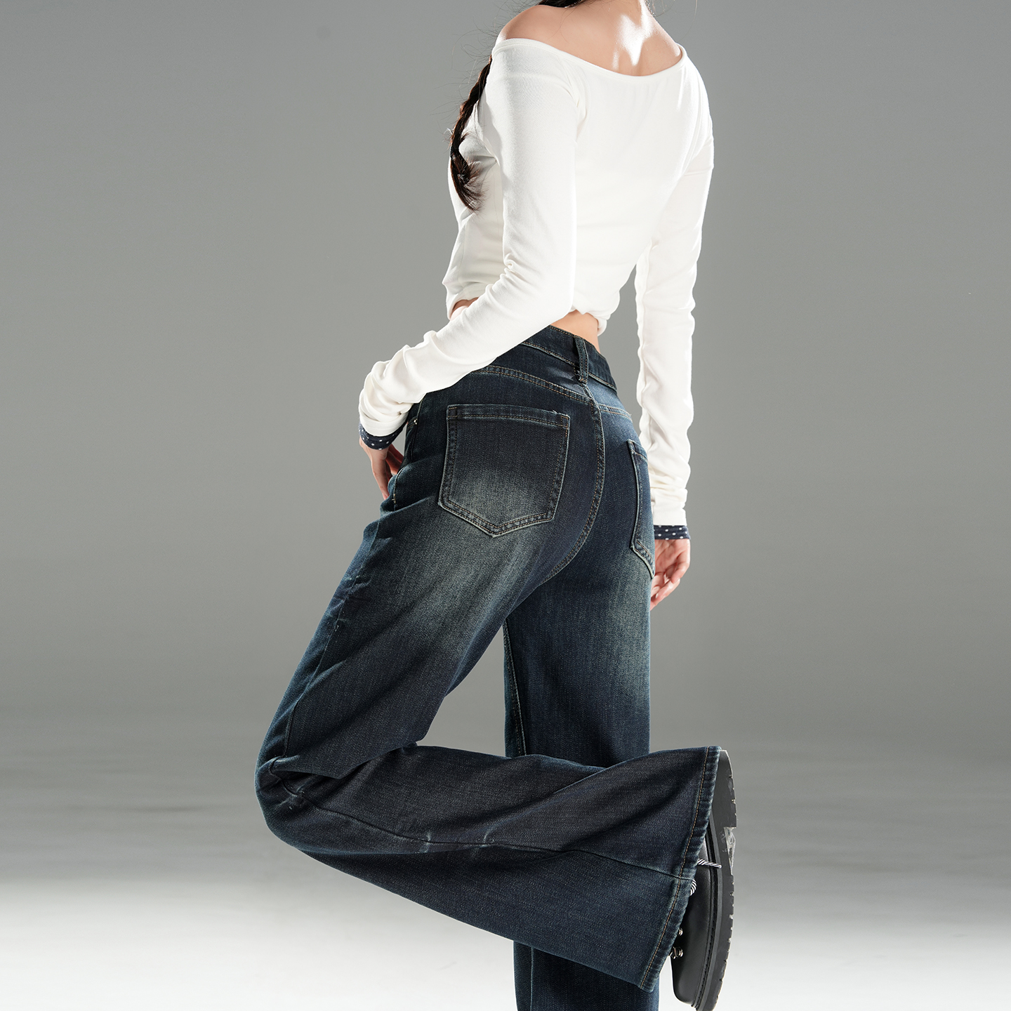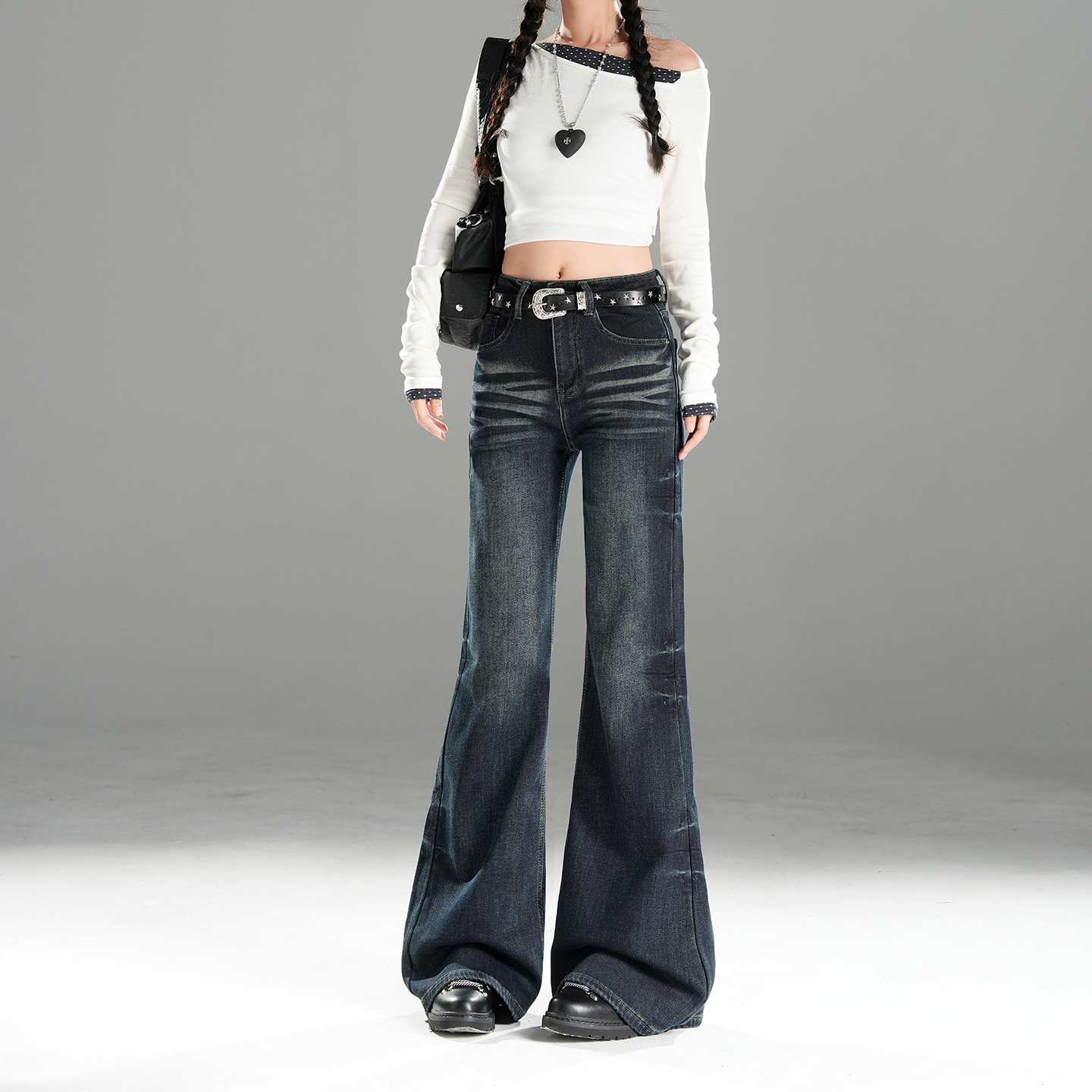 175超长高腰宽松显瘦微喇牛仔裤 高个子加长弯刀阔腿牛仔裤 女大码