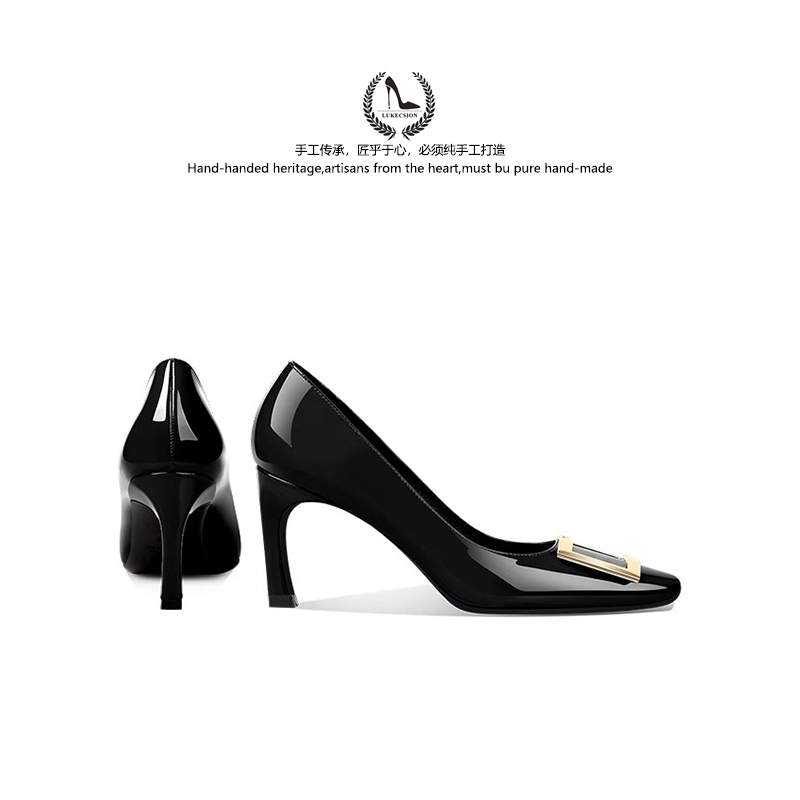 新款 康莉春季 高跟单鞋 女方头真皮通勤时尚 子 方扣浅口鞋 博主推荐