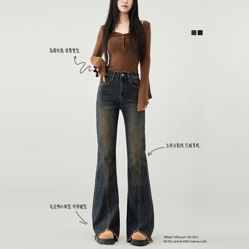 秋冬明线拼接设计垂感裤 高腰牛仔裤 子女J 港风阔腿时尚 班尼路经典