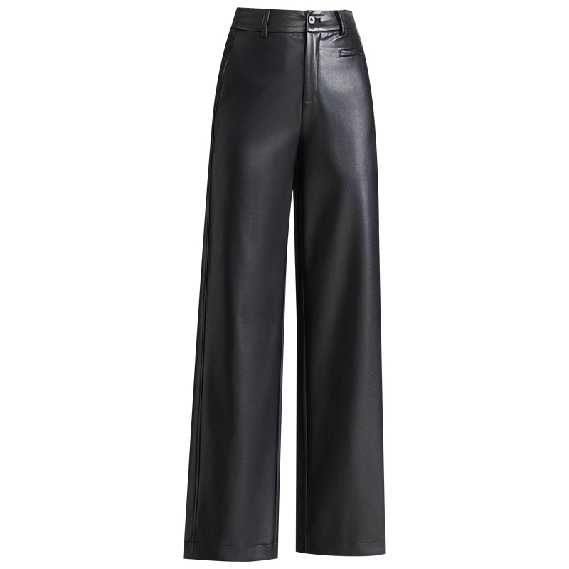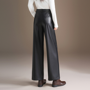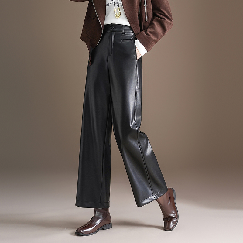 小个子pu皮时髦阔腿裤 欧货高腰显瘦直筒裤 女秋冬新款 黑色九分皮裤