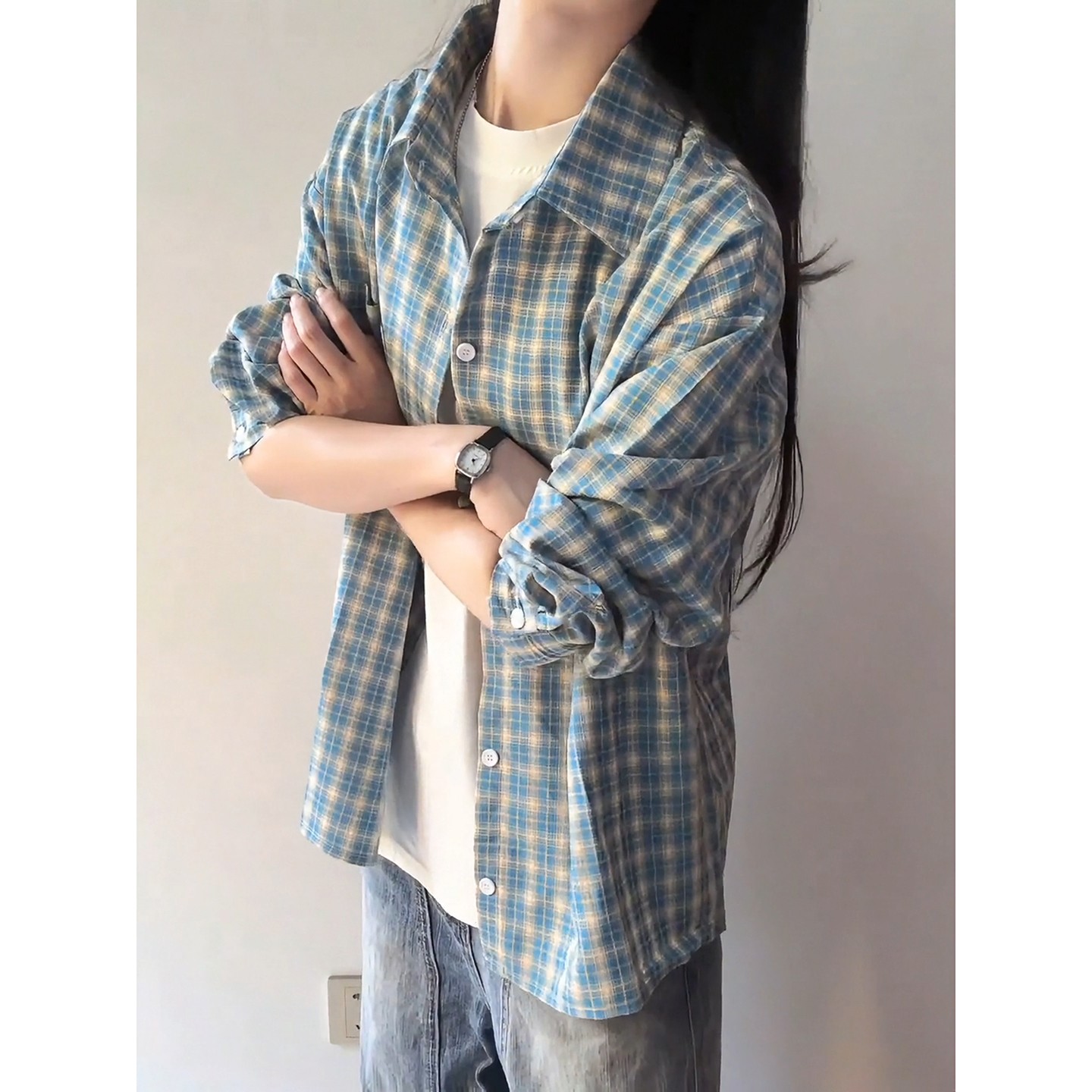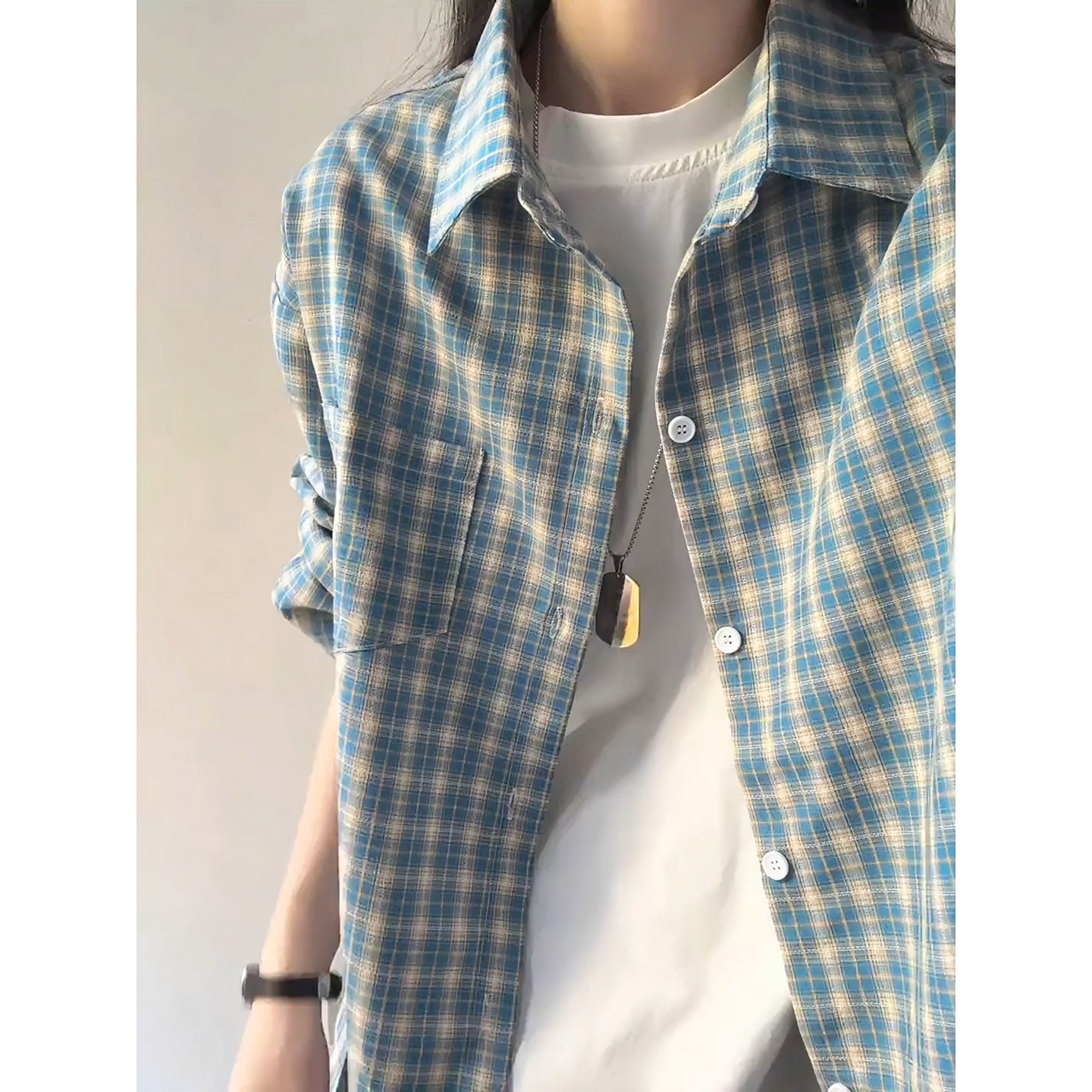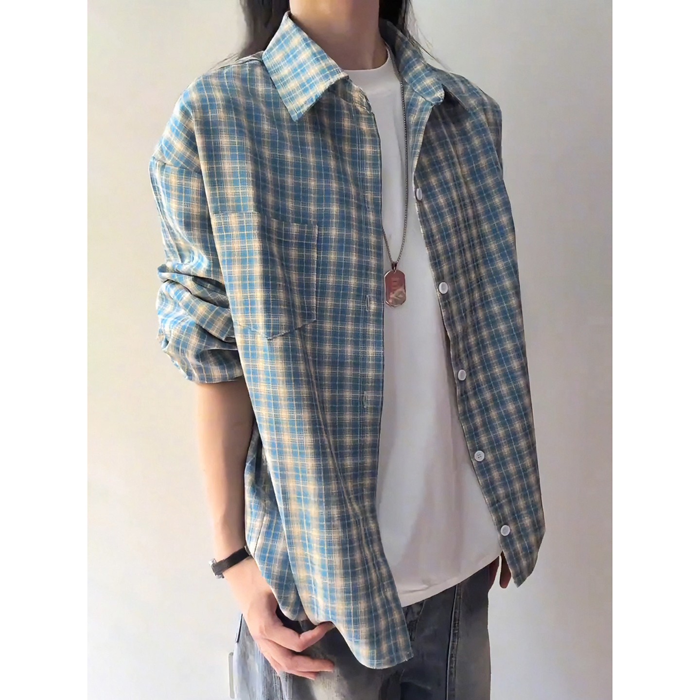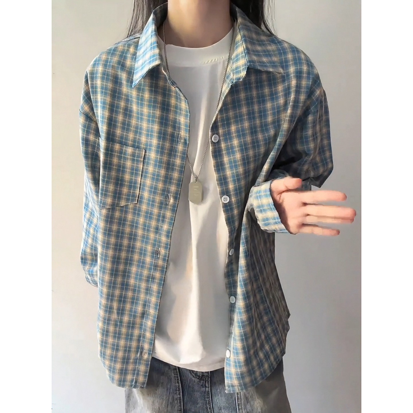 慵懒风长袖 孔雀蓝格子衬衫 美式 秋季 衬衣cleanfit休闲情侣外套 男款
