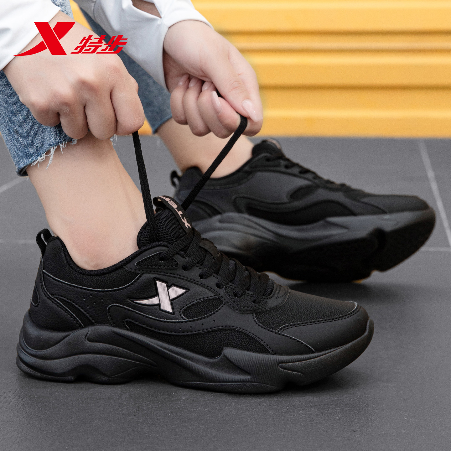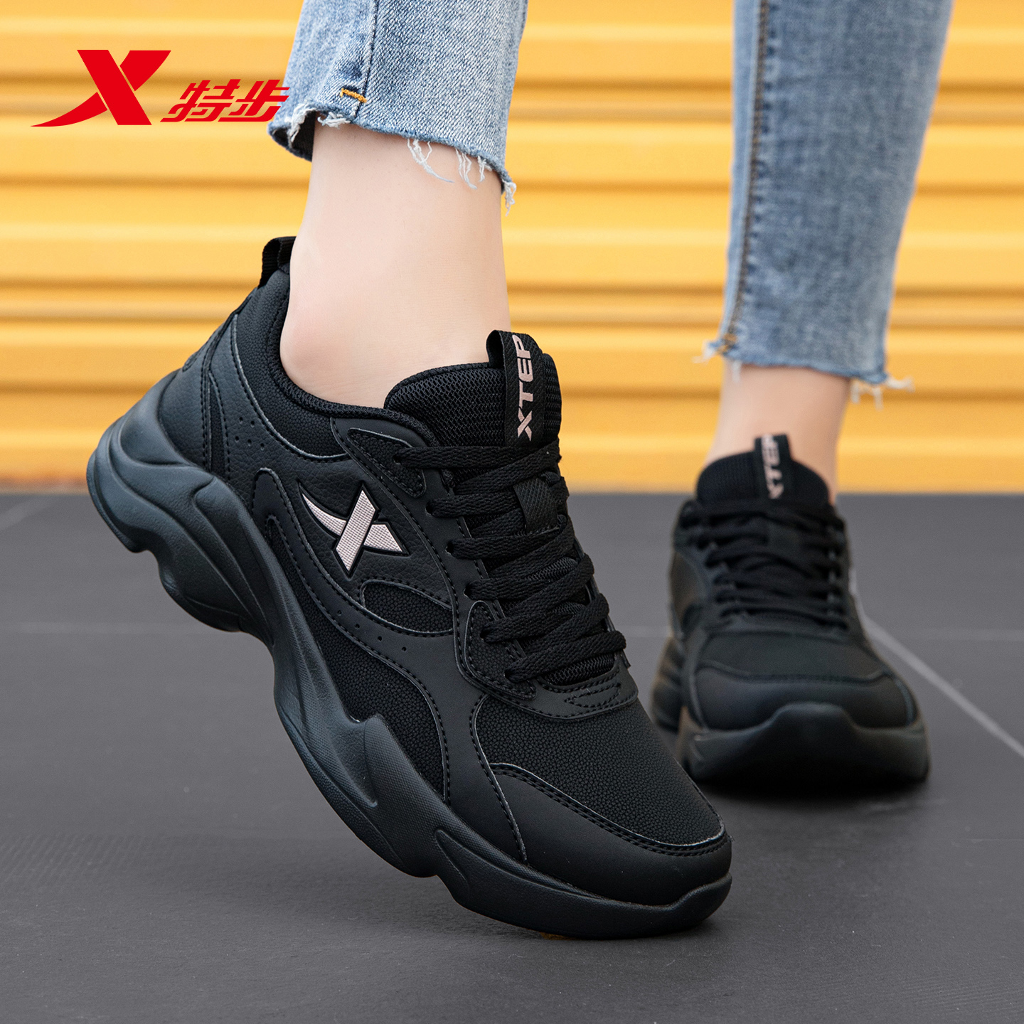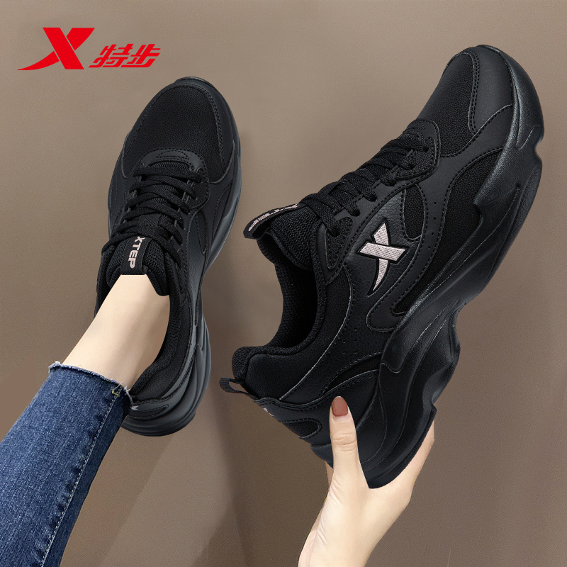 2025新款 皮面运动鞋 软底防水跑步休闲鞋 黑色秋季 子男正品 特步男鞋