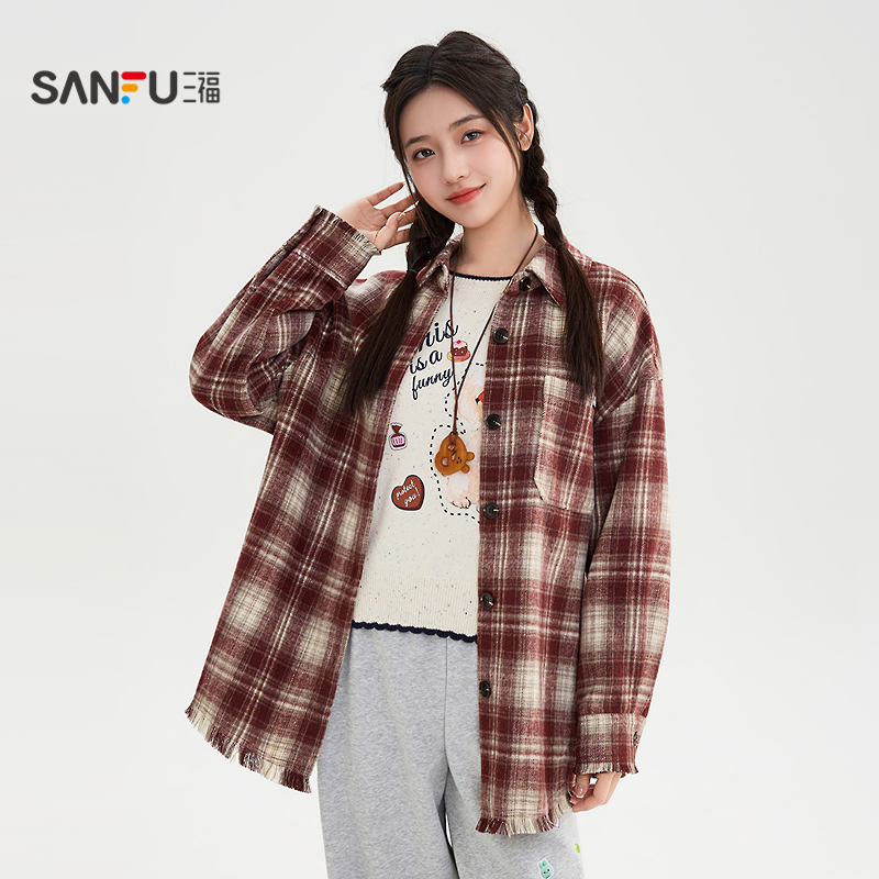 翻领宽松上衣女装 三福格纹外套2025新款 式 毛边流苏衬衫 508604 秋季