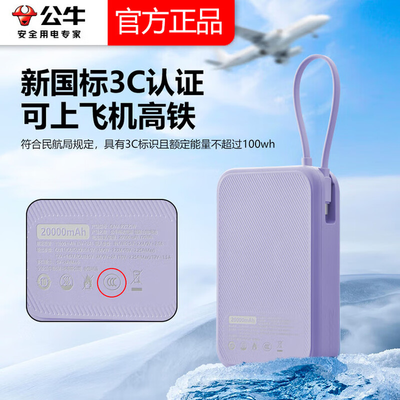 公牛自带线充电宝华为22.5超级快充苹果小米PD20w快充20000毫安超大容量便携移动电源 3C认证充电宝