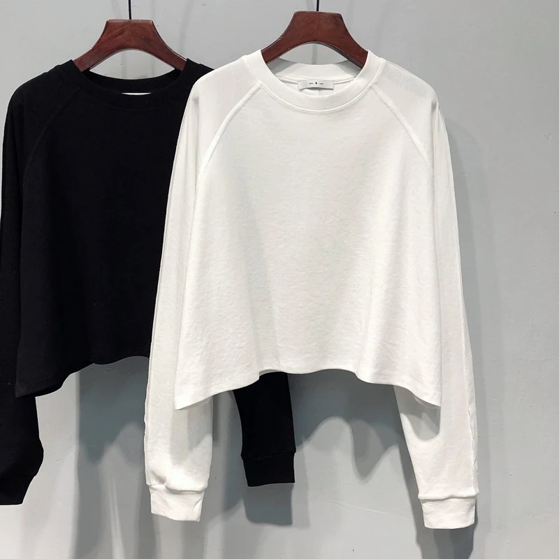 上衣女春秋季 白色长袖 圆领短款 宽松胖mm显瘦蝙蝠袖 t恤女2025新款