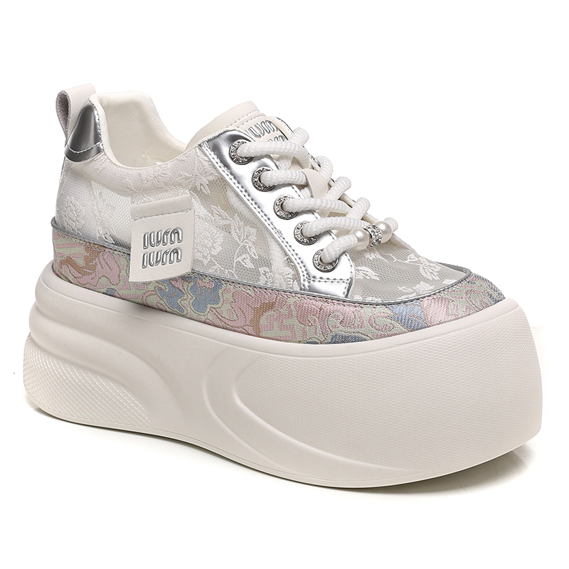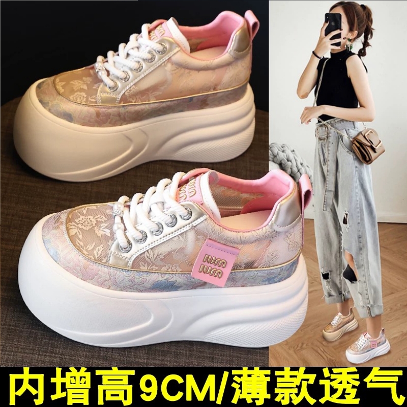 显脚小 潮百搭松糕厚底单鞋 透气网面蕾丝休闲鞋 女内增高2025年新款