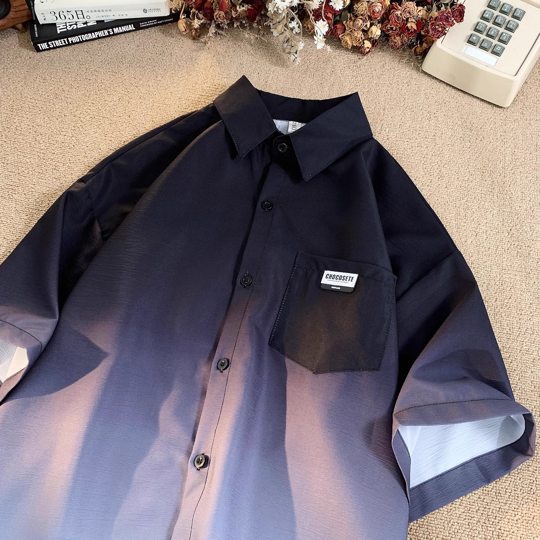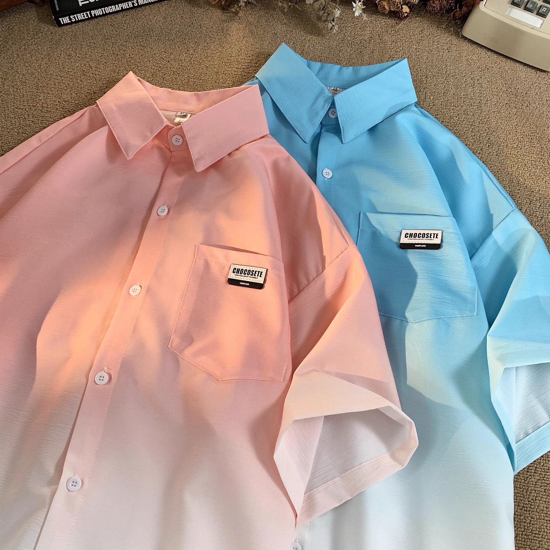 美式 大码 男夏季 短袖 潮牌口袋贴标宽松休闲情侣衬衣2 300斤渐变衬衫