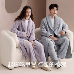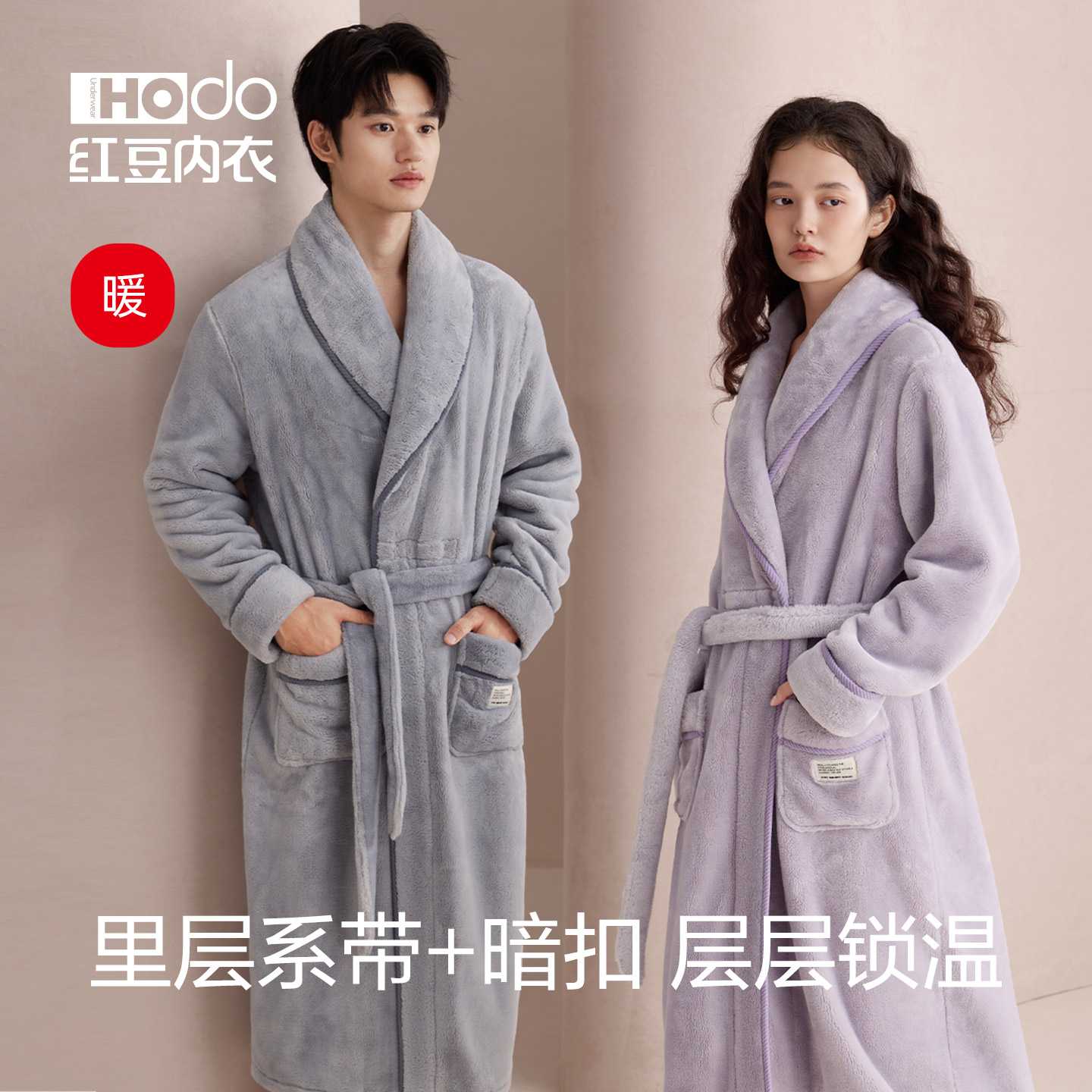 红豆情侣睡袍抗静电女珊瑚绒长款 浴袍家居服 睡衣冬加厚法兰绒男士