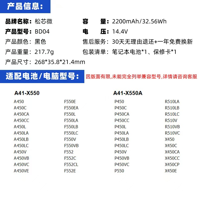 X550a fh5900v笔记本电池 A550J W40C k550j a41 A450C Y581C Y481C FX50JX 适用于华硕X550V X450V F450V